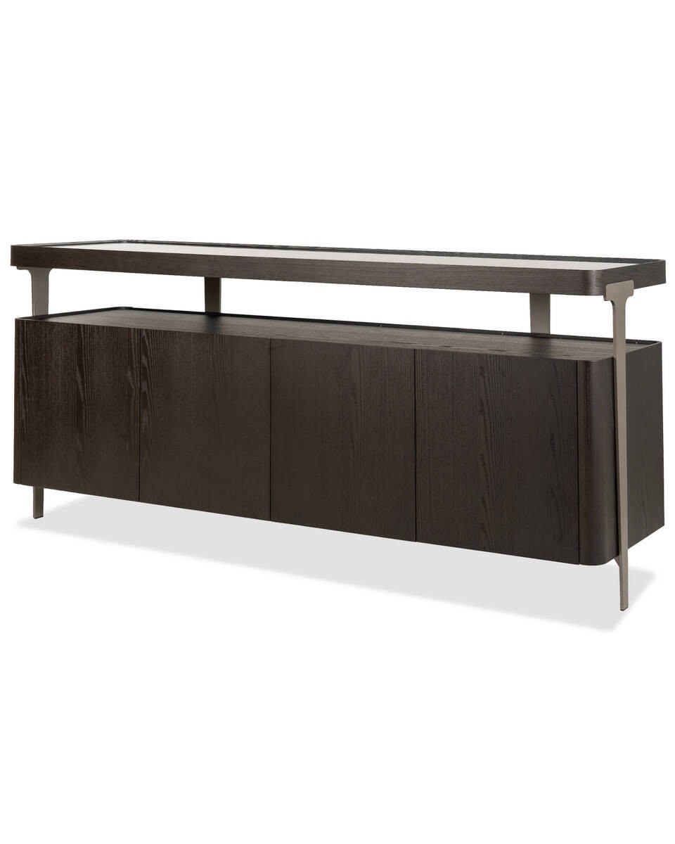 El aparador Bruma destaca por su elegancia contenida y diseño arquitectónico. Con una tapa superior de cristal templado ahumado y un marco en madera maciza teñida en marrón oscuro, combina funcionalidad y estilo contemporáneo. Su cuerpo, realizado en chapa de fresno oscuro, cuenta con cuatro puertas que ocultan amplios compartimentos con estantes de cristal, perfectos para organizar sin perder estética. Las patas metálicas en gris espacial le aportan ligereza y sofisticación.