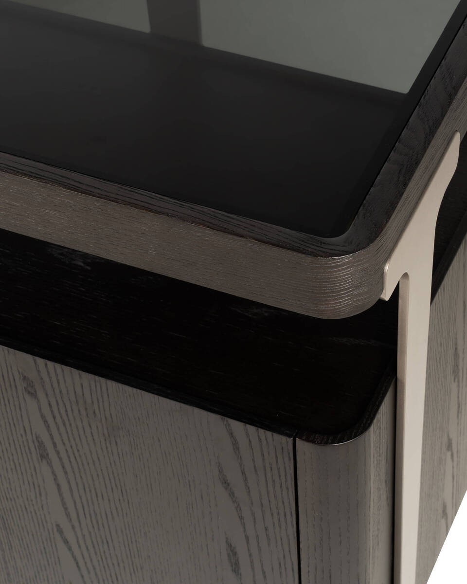 - Materiales: Tapa de cristal templado ahumado; marco superior en madera maciza teñida en negro; cuerpo en chapa de fresno con 4 puertas; estantes interiores de cristal; patas metálicas en acabado gris espacial