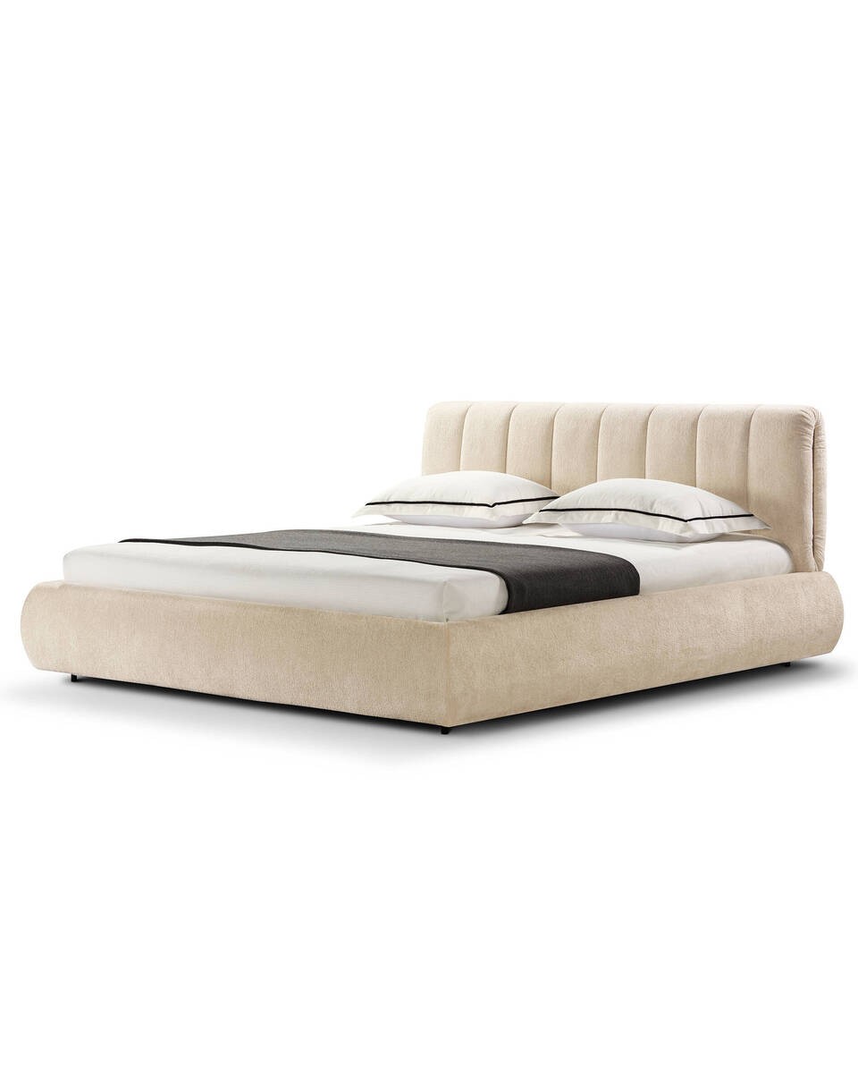 Una cama de líneas suaves y estilo contemporáneo que aporta elegancia y confort al dormitorio. Su cabecero acolchado con tapizado en tejido beige invita al descanso, mientras que los acabados metálicos en níquel cepillado aportan un toque sofisticado.