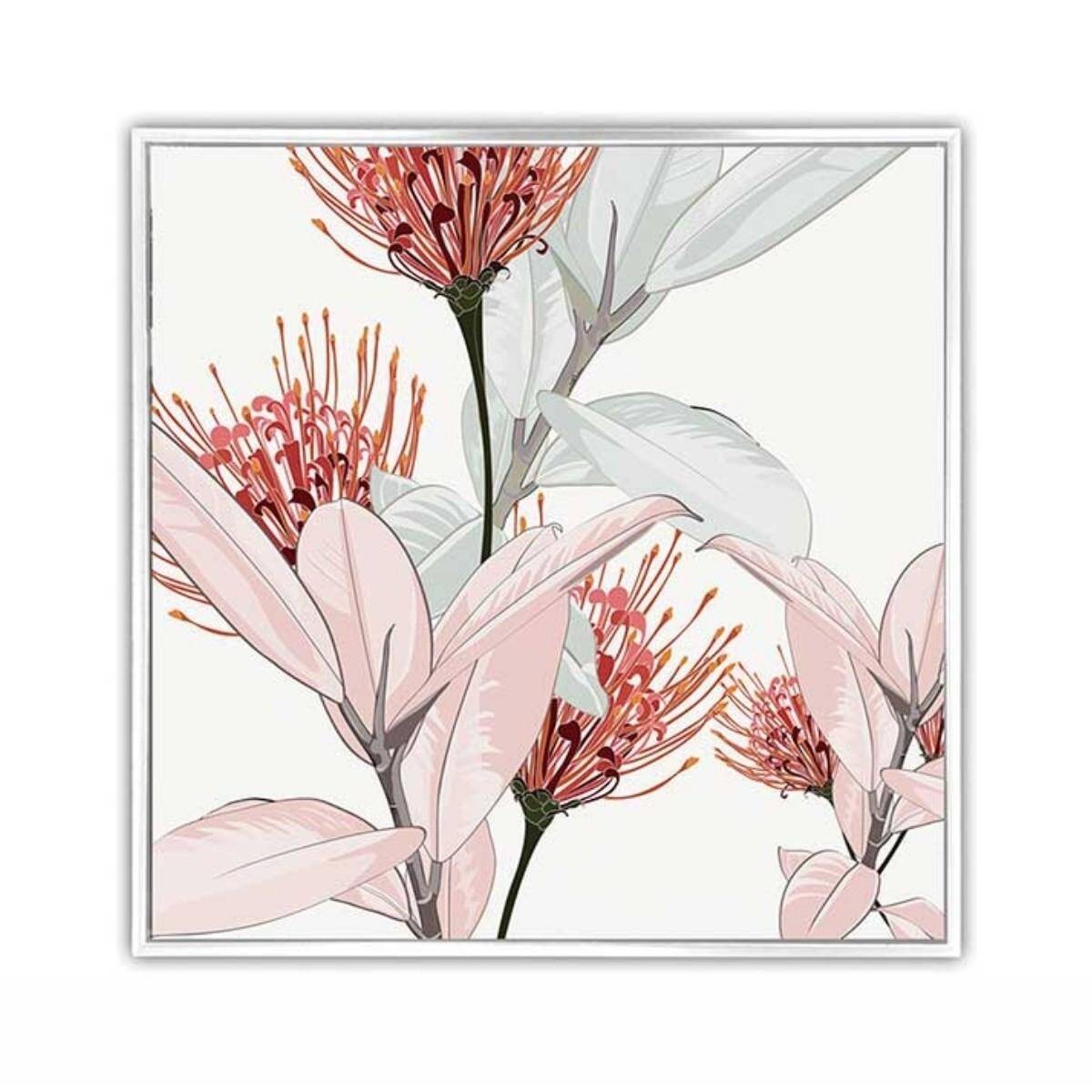 Bonito cuadro inspirado en un romántico paisaje de flores en tono pastel sobre fondo blanco. Se trata de una imagen realizada con la técnica de fotoimpresión, sobre un bastidor de madera natural y un fino marco decorativo de poliestireno en color blanco. Ideal para dormitorios o salones de estilo clásico.