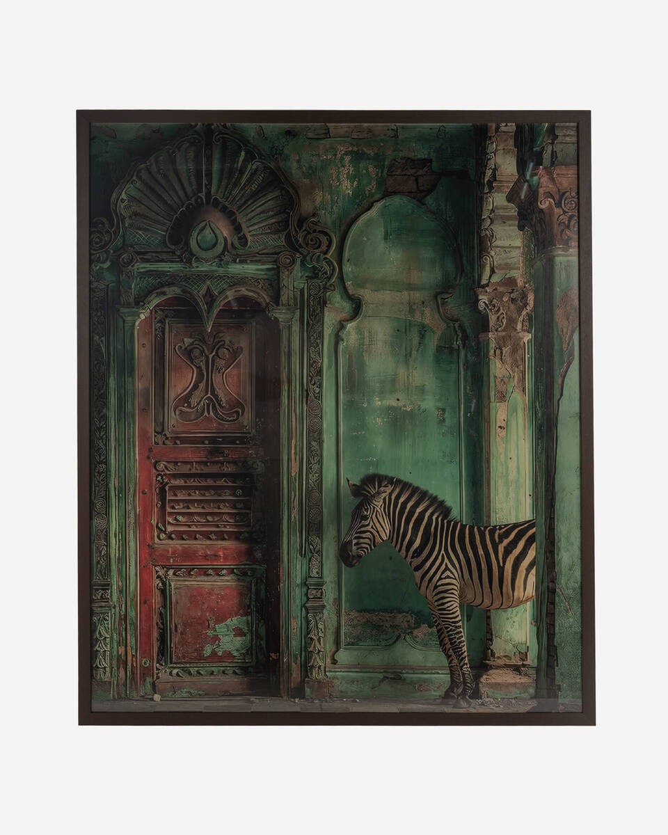 Este cuadro decorativo de gran formato (100 x 120 cm) combina la fuerza de la naturaleza con la belleza del arte arquitectónico. El marco en madera oscura aporta elegancia y calidez, mientras que la imagen muestra una cebra frente a una puerta antigua en tonos rojizos y verdes desgastados. El contraste entre lo salvaje y lo urbano genera una escena exótica y misteriosa que invita a soñar y reflexionar.