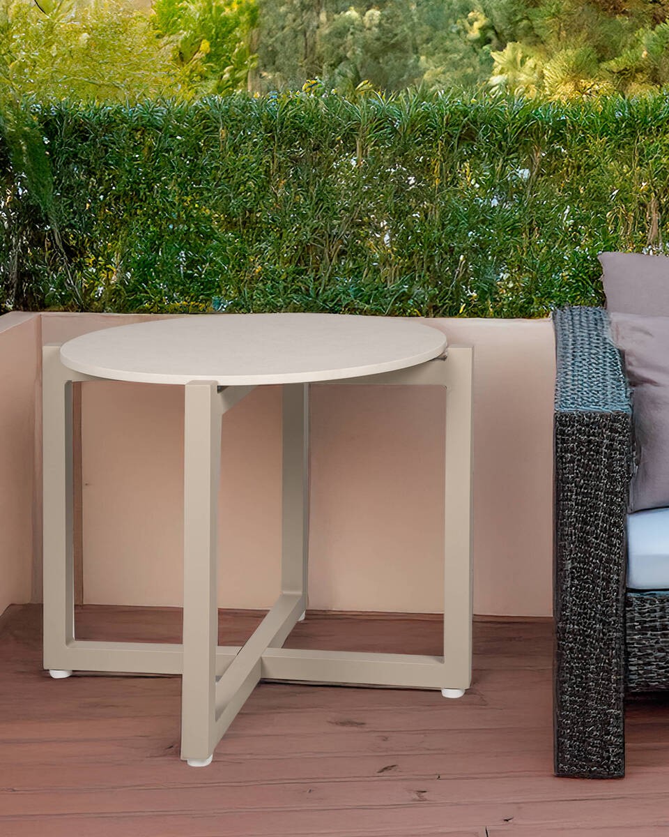 MESA DE RINCÓN DE TERRAZA TESSA DE ALUMINIO Y TAPA DE CERÁMICA CREMA 54x45cm