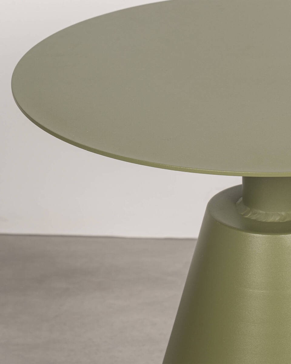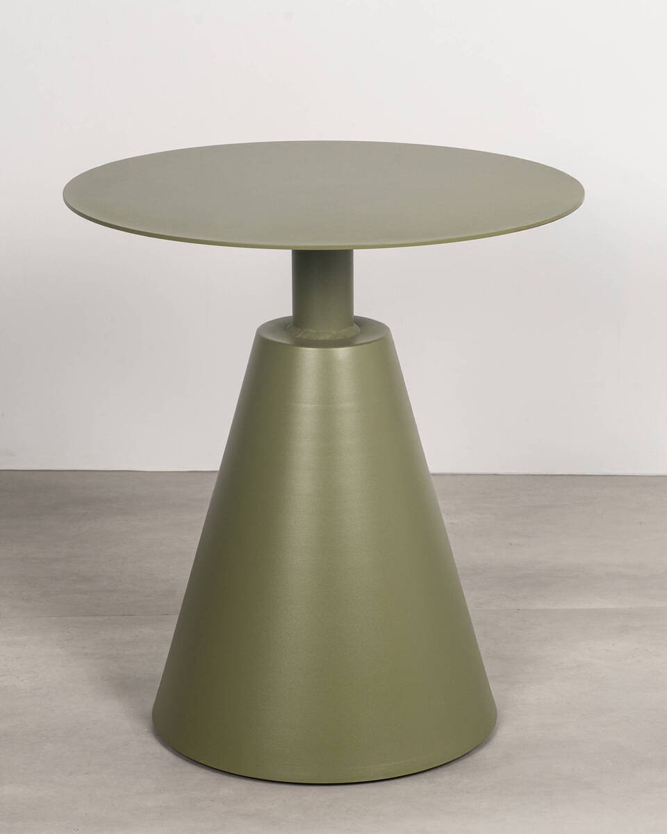 La mesa exterior Oliva de estilo moderno con diseño cónico y acabado en verde oliva, que aporta frescura y personalidad a cualquier espacio. Perfecta para terrazas, salones o como pieza decorativa en ambientes contemporáneos.