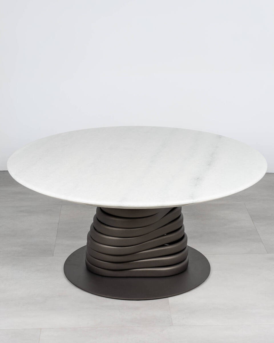 Una pieza escultórica y elegante para tu salón gracias a la combinación de su sobre de mármol natural blanco y su base central en bronce oscuro. El pedestal, formado por volúmenes ondulados, crea un efecto dinámico que contrasta con la pureza del tablero, convirtiéndola en una pieza protagonista ideal para salones contemporáneos y ambientes sofisticados.