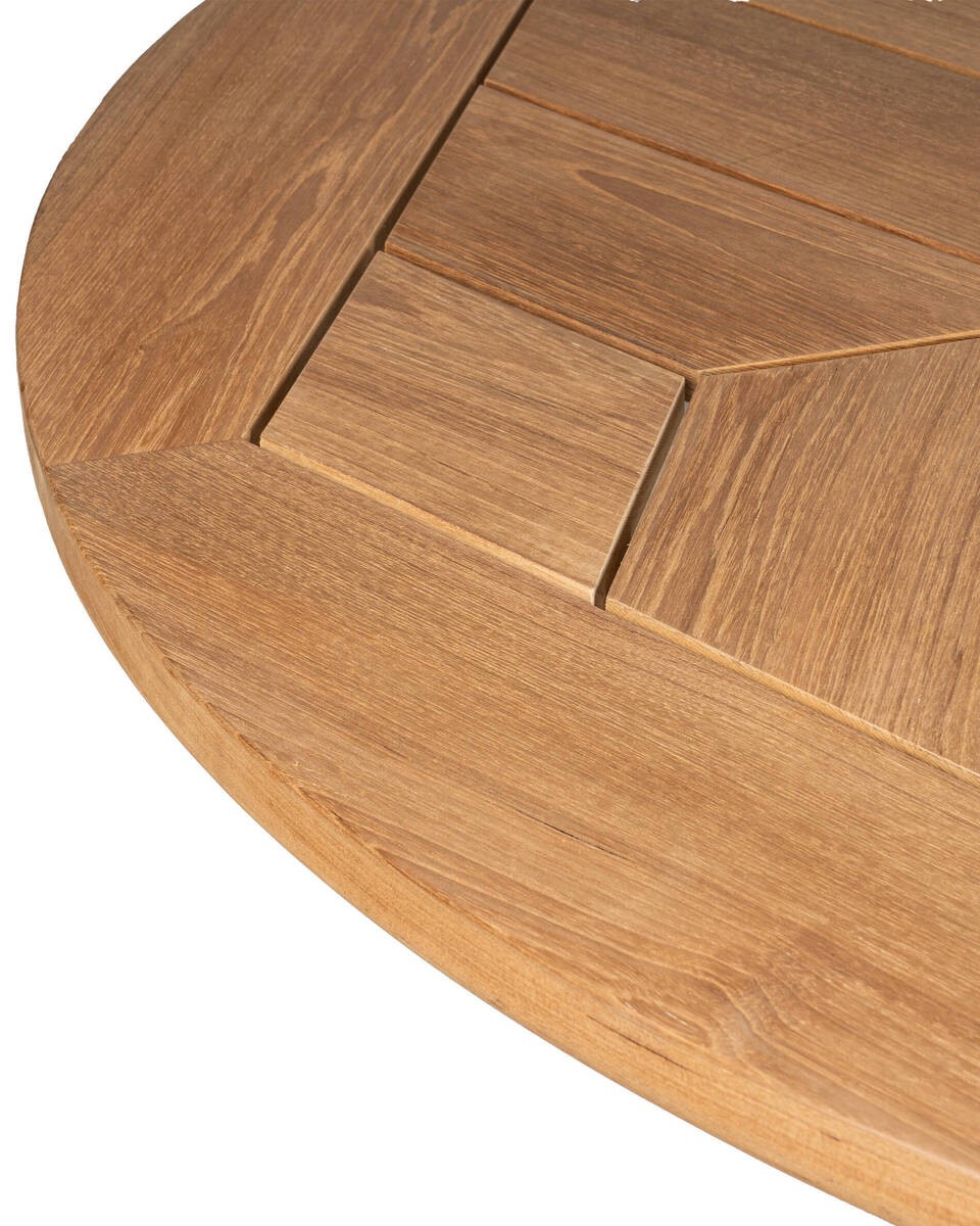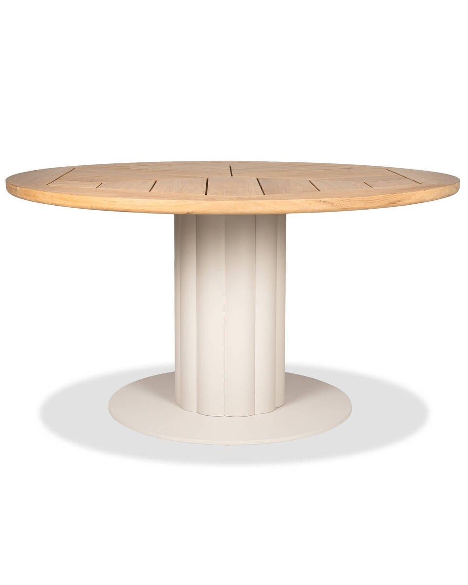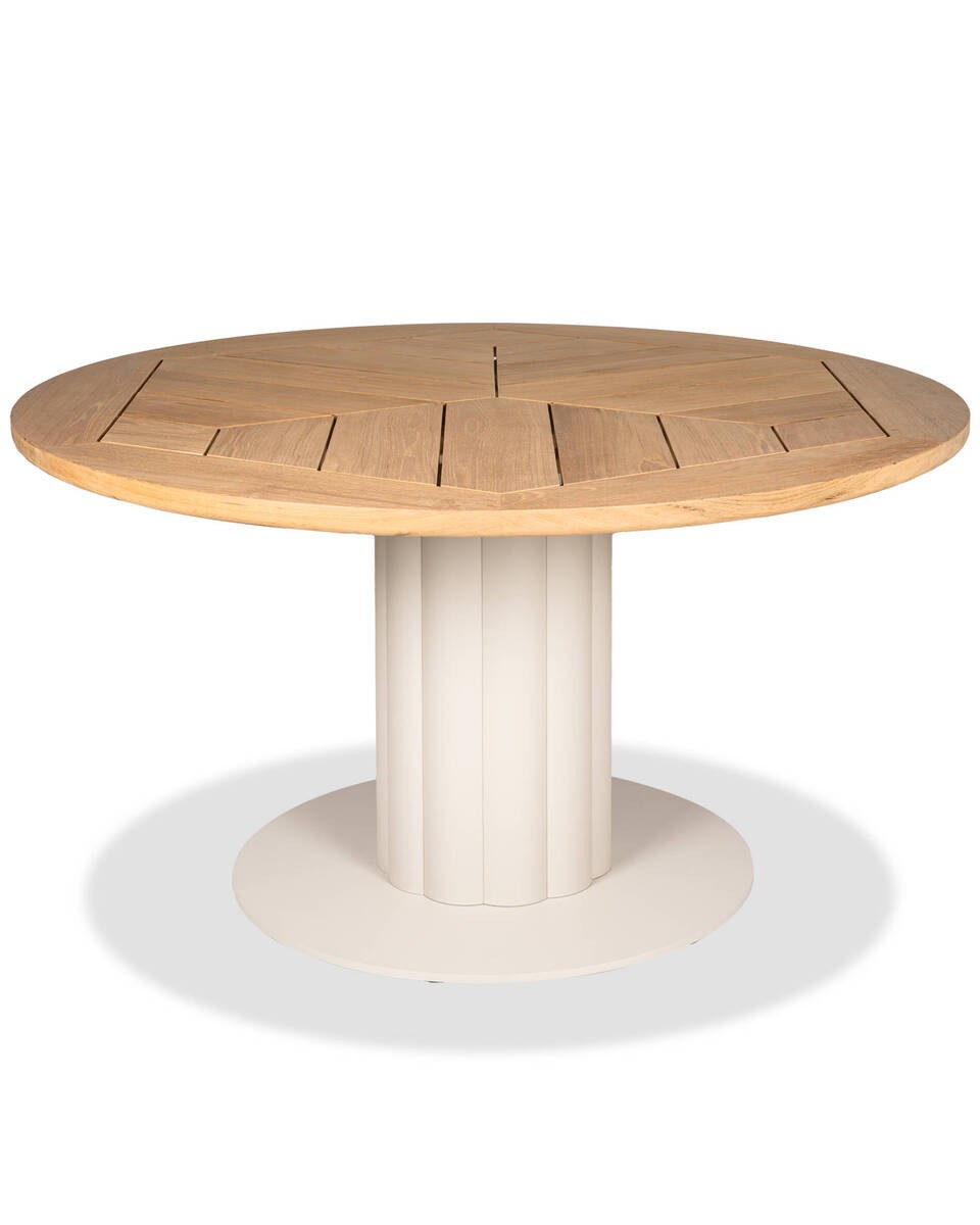Combina diseño natural y sofisticado, ideal para realzar cualquier espacio exterior cubierto. Su tapa redonda de 140 cm de diámetro está fabricada en madera de teca, con un diseño de líneas rectas que resalta la belleza de sus materiales naturales. La base, en forma de curvas elegantes y en color beige, aporta un contraste suave y contemporáneo, ofreciendo estabilidad y un toque moderno a esta pieza única.
