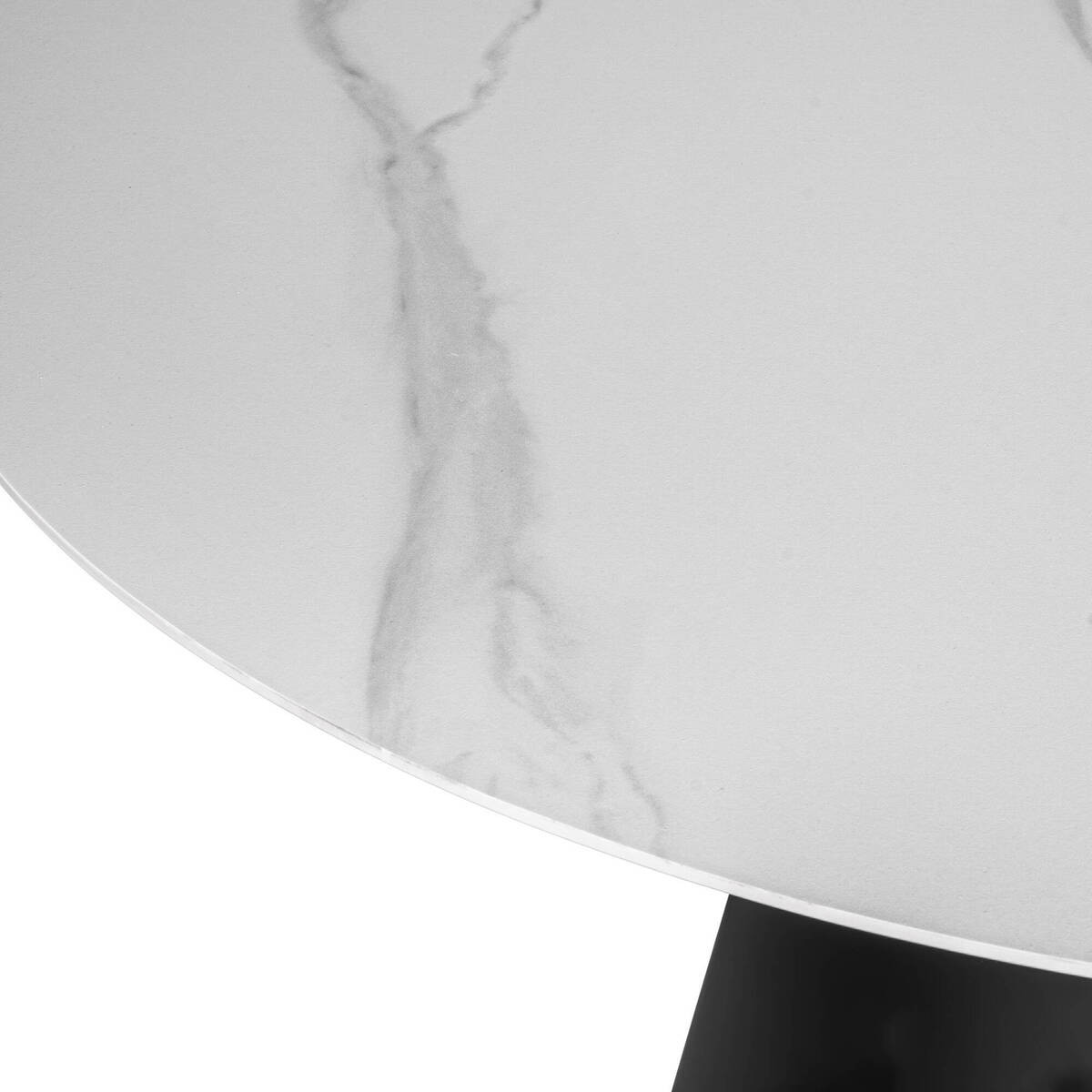 Marca un estilo industrial y moderno con esta mesa fabricada con metal negro en su base de forma cónica y líneas simples, sumada de una tapa de cerámica blanca con texturas grises. Sus dimensiones de 135cm de diámetro permiten hasta 6 comensales.