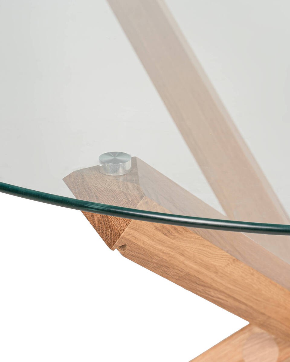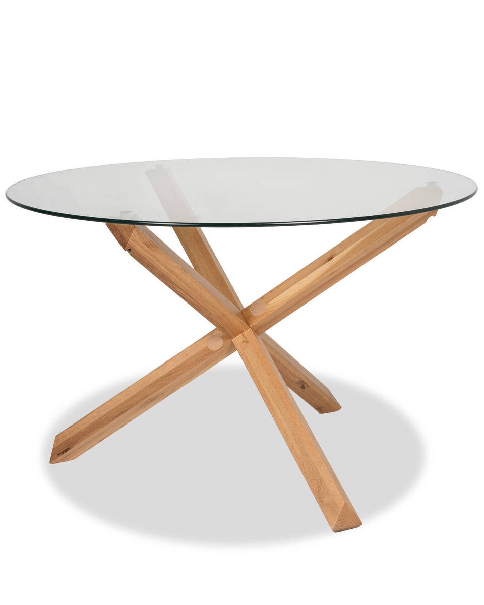 MESA CENDRA DE COMEDOR REDONDA DE TAPA DE CRISTAL Y PATAS CRUZADAS DE ROBLE 120x75cm