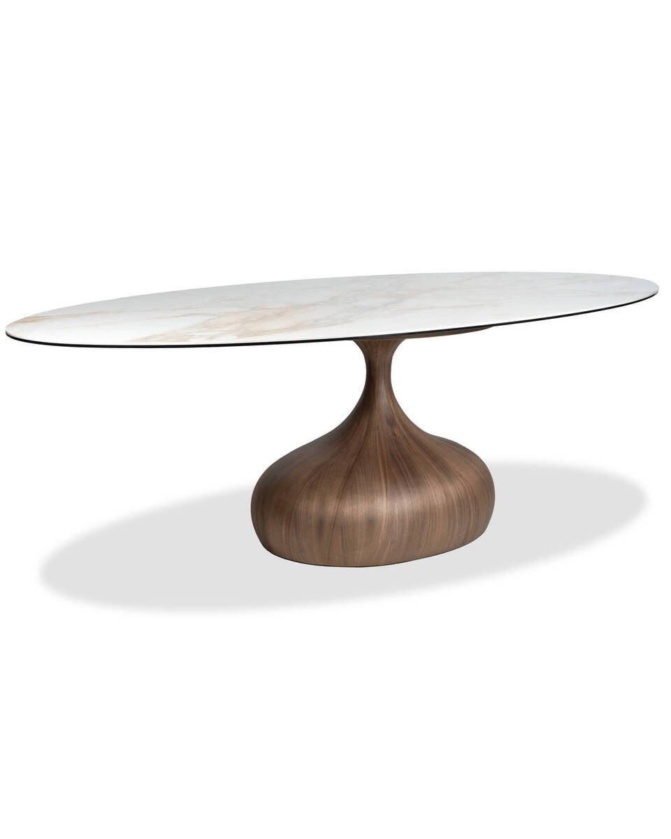 Con un diseño elegante y fluido, esta mesa de comedor ovalada destaca por su combinación de materiales nobles y formas orgánicas. La tapa en cristal templado con cerámica blanca brillante aporta sofisticación, mientras que su base en fibra de vidrio con acabado en chapa de nogal evoca la calidez de la madera natural. Ideal para comedores modernos que buscan una pieza protagonista.