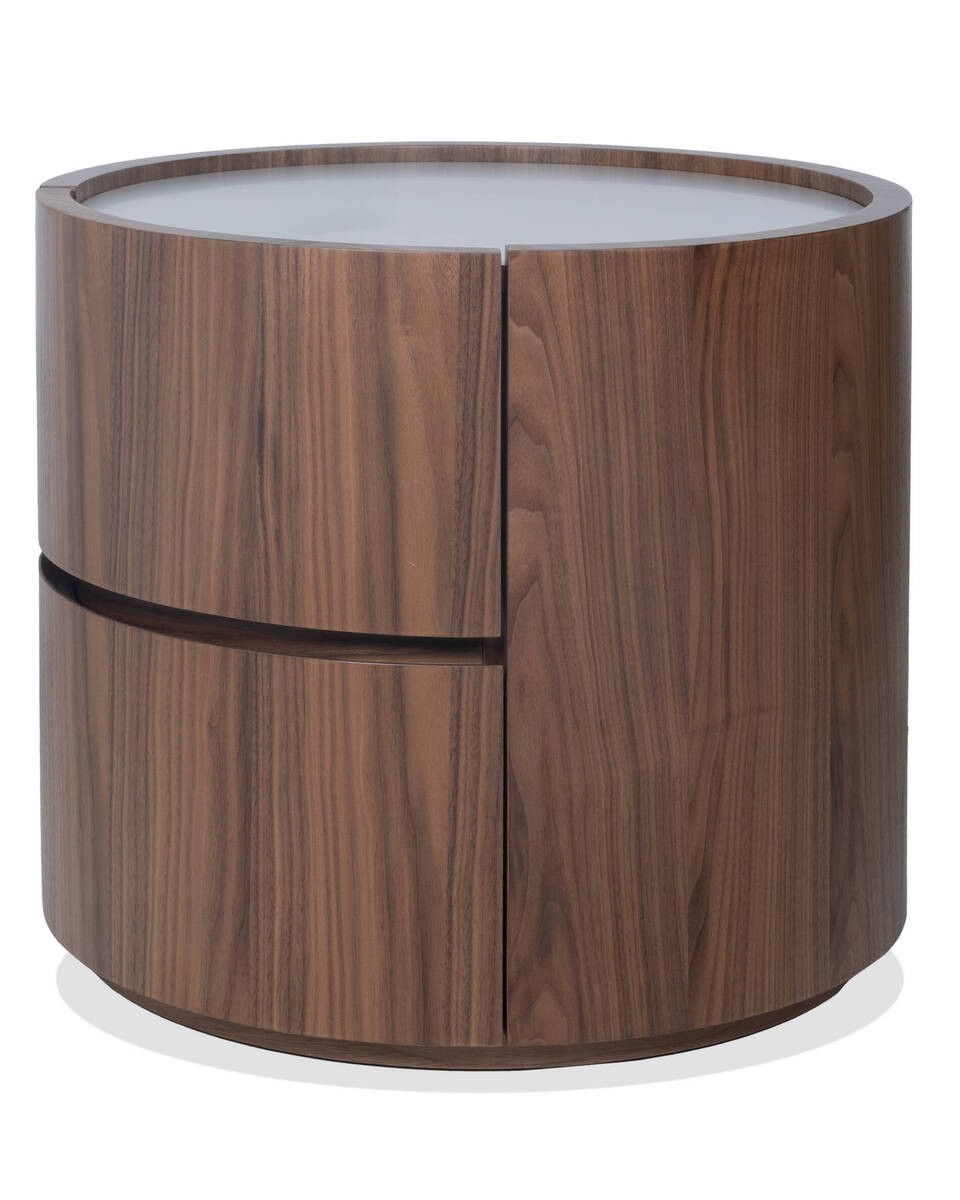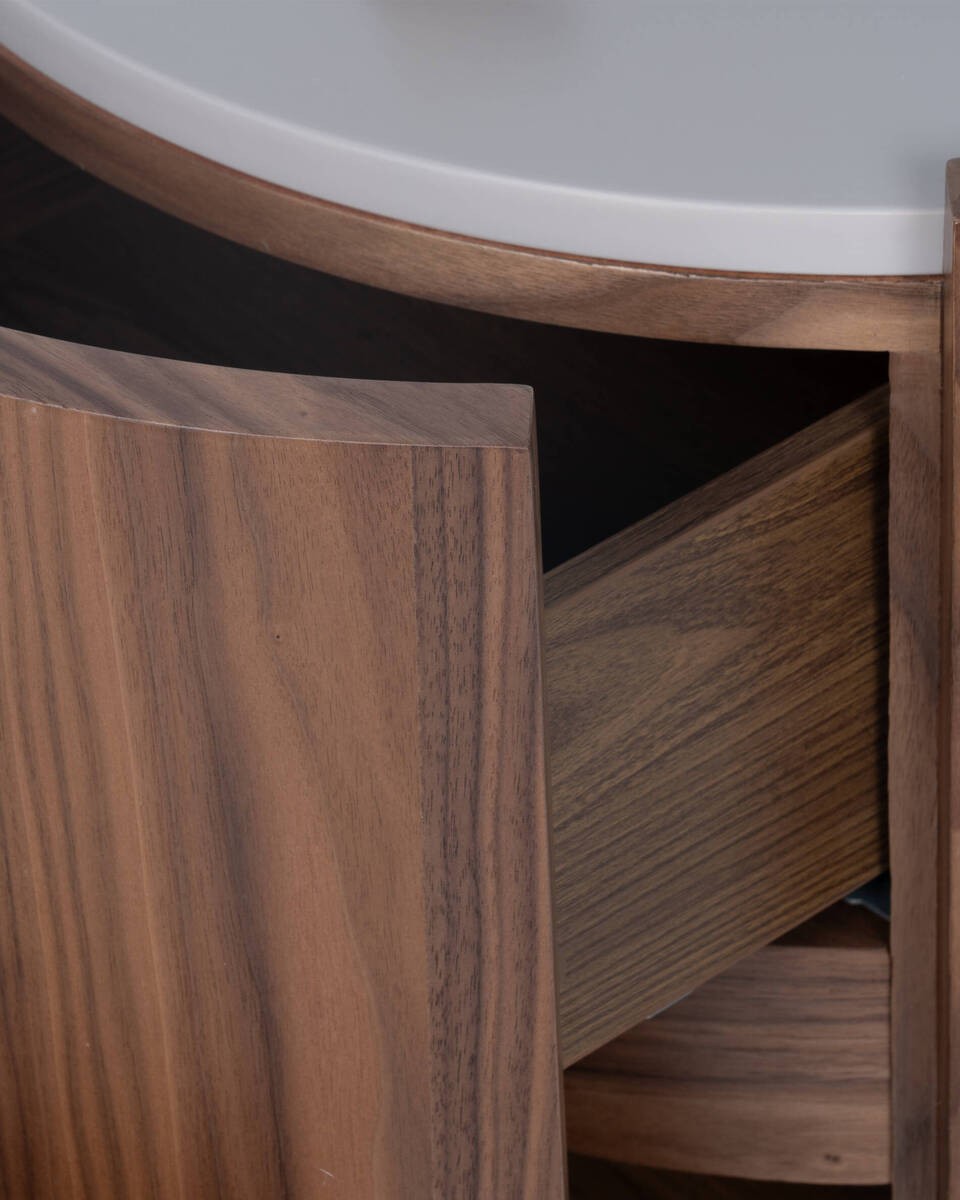 Un diseño curvo, elegante y de considerables dimensiones, con un acabado en chapa de nogal que aporta calidez y sofisticación. Su sobre en color marfil mate ofrece un atractivo contraste, mientras que sus dos cajones brindan funcionalidad sin comprometer el estilo moderno.