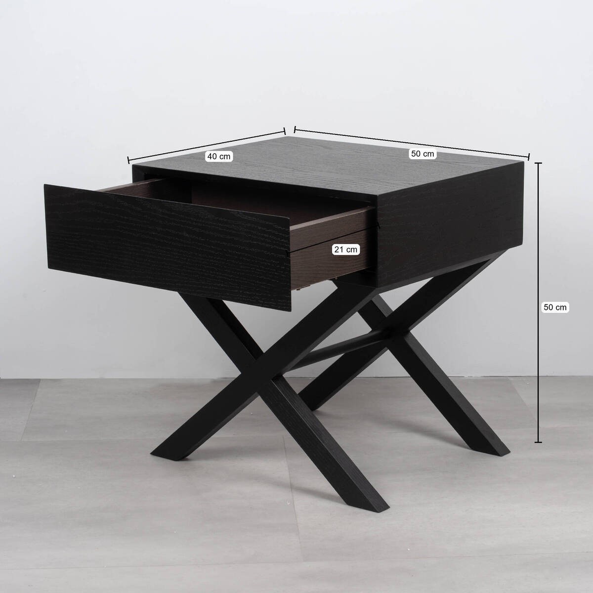 Mesita de noche Elba negra con un cajón y estructura cruzada