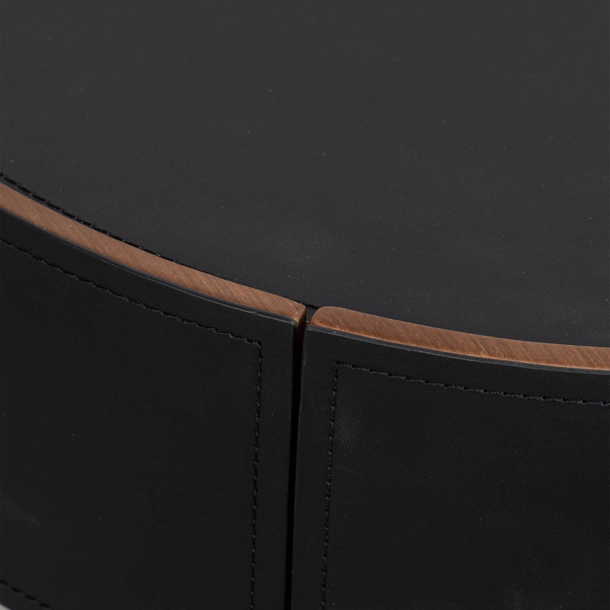 Mesita de noche Orbit redonda tapizada en piel negra con patas metálicas y tres cajones