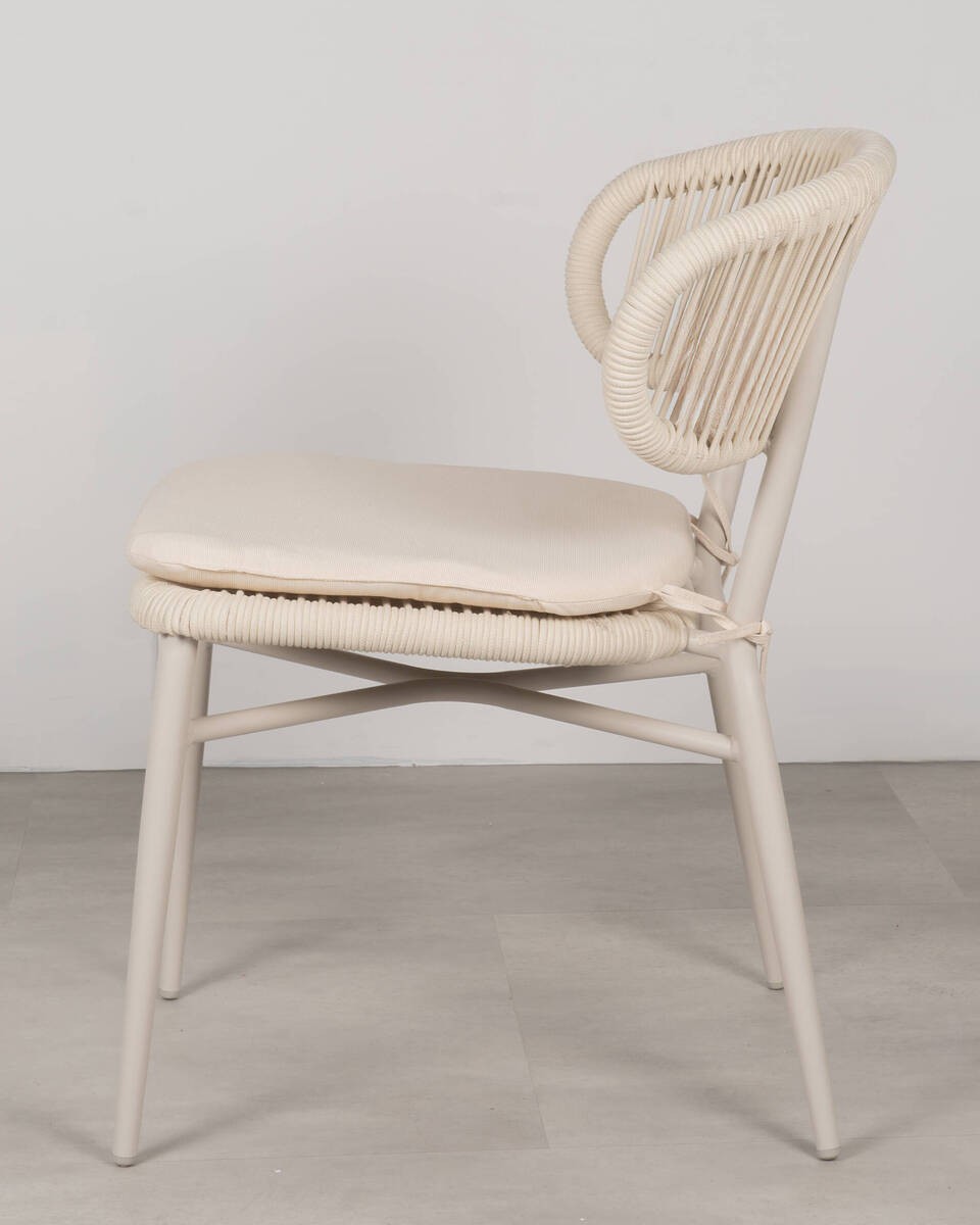 Silla de comedor con estructura ligera de aluminio y un respaldo envolvente en ratán sintético trenzado. Su estilo fresco y natural aporta calidez a cualquier ambiente, ideal para interior o exterior cubierto. Incluye cojín desenfundable para mayor comodidad.