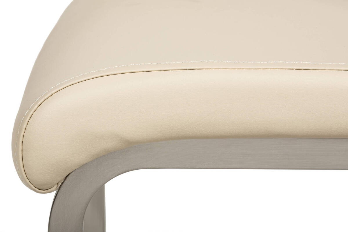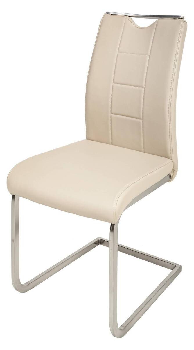 Elegante silla de diseño moderno tapizada en piel sintética color beige claro con detalles de hilo del mismo color y patas en níquel cepillado de suspensión libre.