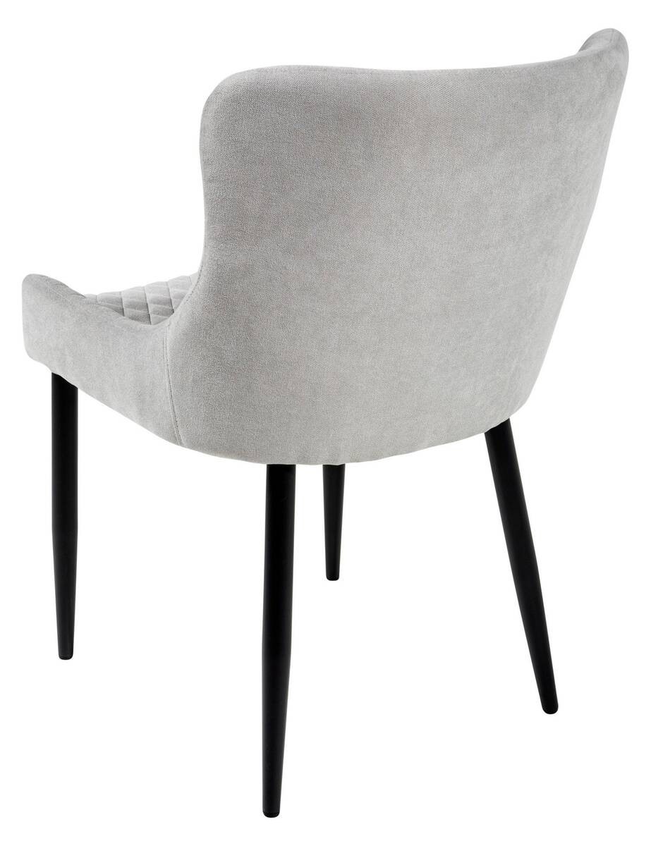 Podríamos decir que se trata de una silla de diseño atemporal en la que se combina un asiento y respaldo de forma curva con un tapizado en color gris claro que rememora al lino y que contrasta a la perfección con sus patas metálicas negras.