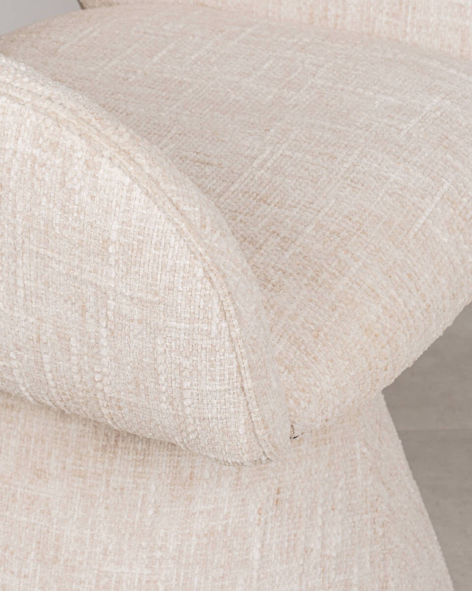 - Tapizado: Tejido bouclé (poliéster) color beige, suave y duradero.