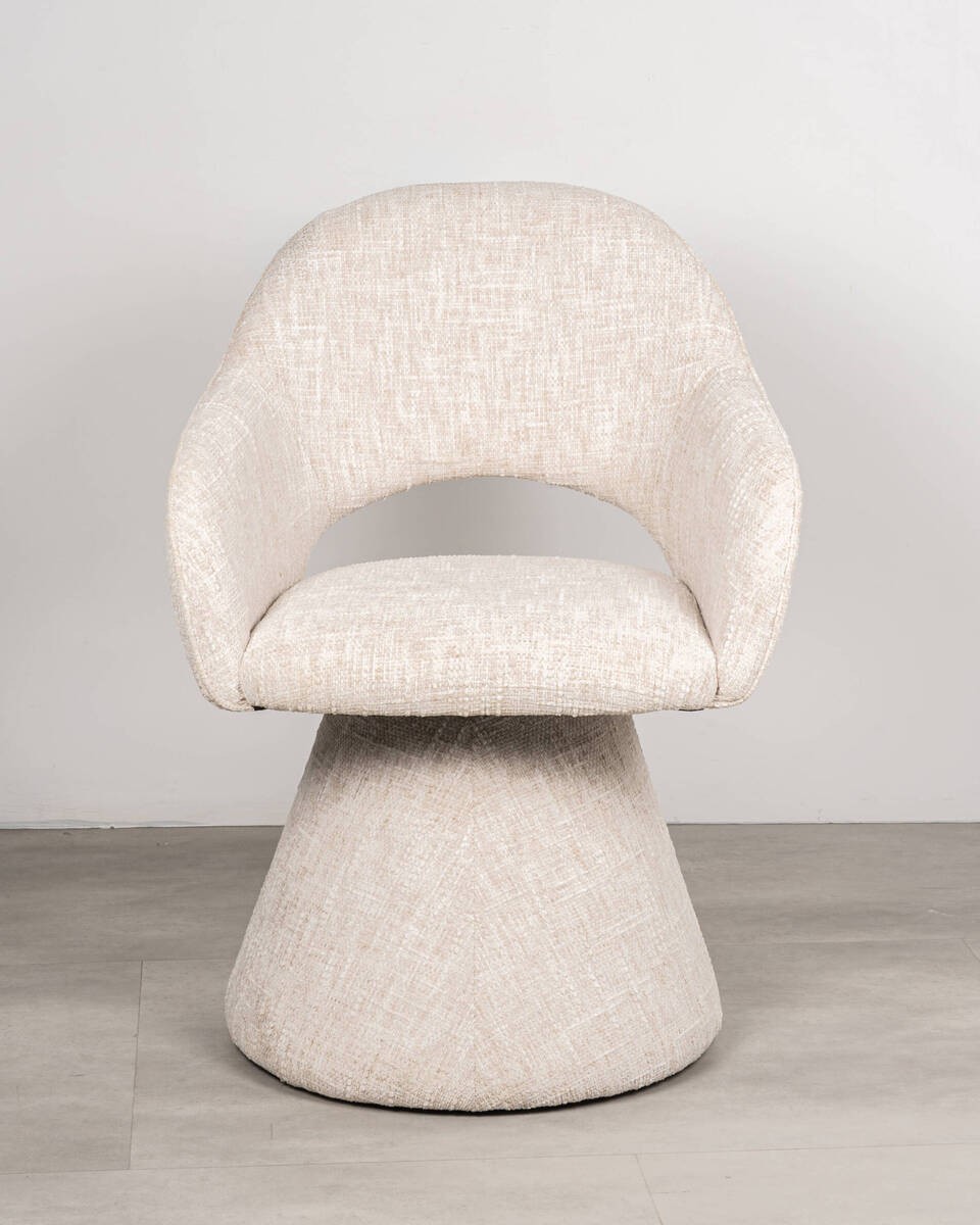Silla giratoria de líneas suaves y diseño envolvente que combina funcionalidad y elegancia. Su tapizado en tejido bouclé beige aporta calidez y textura, mientras que la base tapizada con forma cónica le confiere una estética moderna y equilibrada. Ideal para comedores, despachos o espacios de reunión contemporáneos.