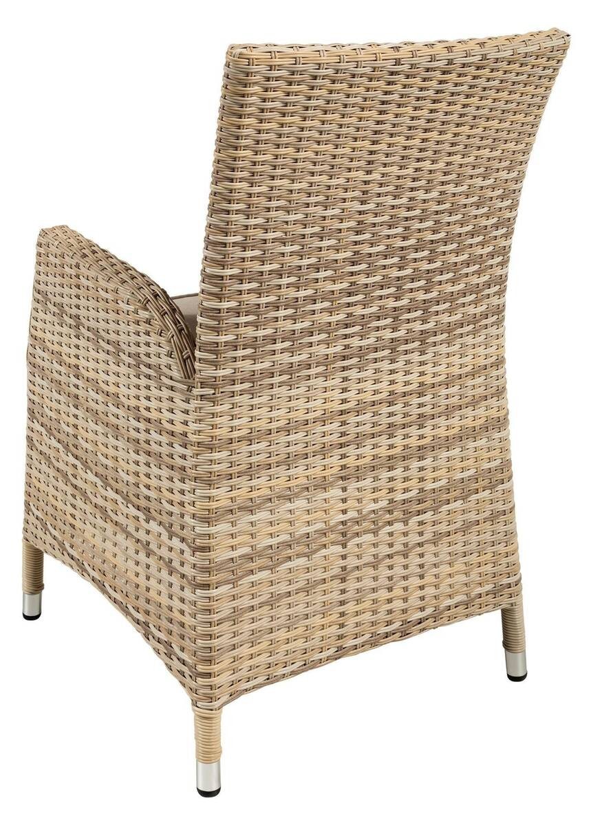 Relájese cómodamente en esta atemporal silla de jardín con reposabrazos realizada con una ligera estructura de aluminio y ratán sintético curvo de doble trenzado en diferentes tonalidades en color crema. Patas de aluminio con tacos de goma de alta calidad para evitar rayar los suelos y reducir el ruido a sus movimientos. Incluye cojín a juego desenfundable y repelente al agua.