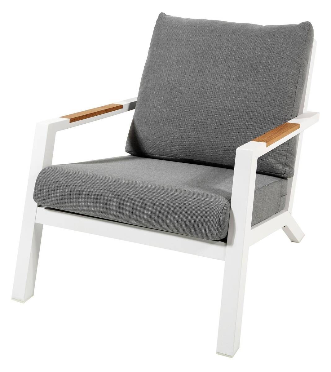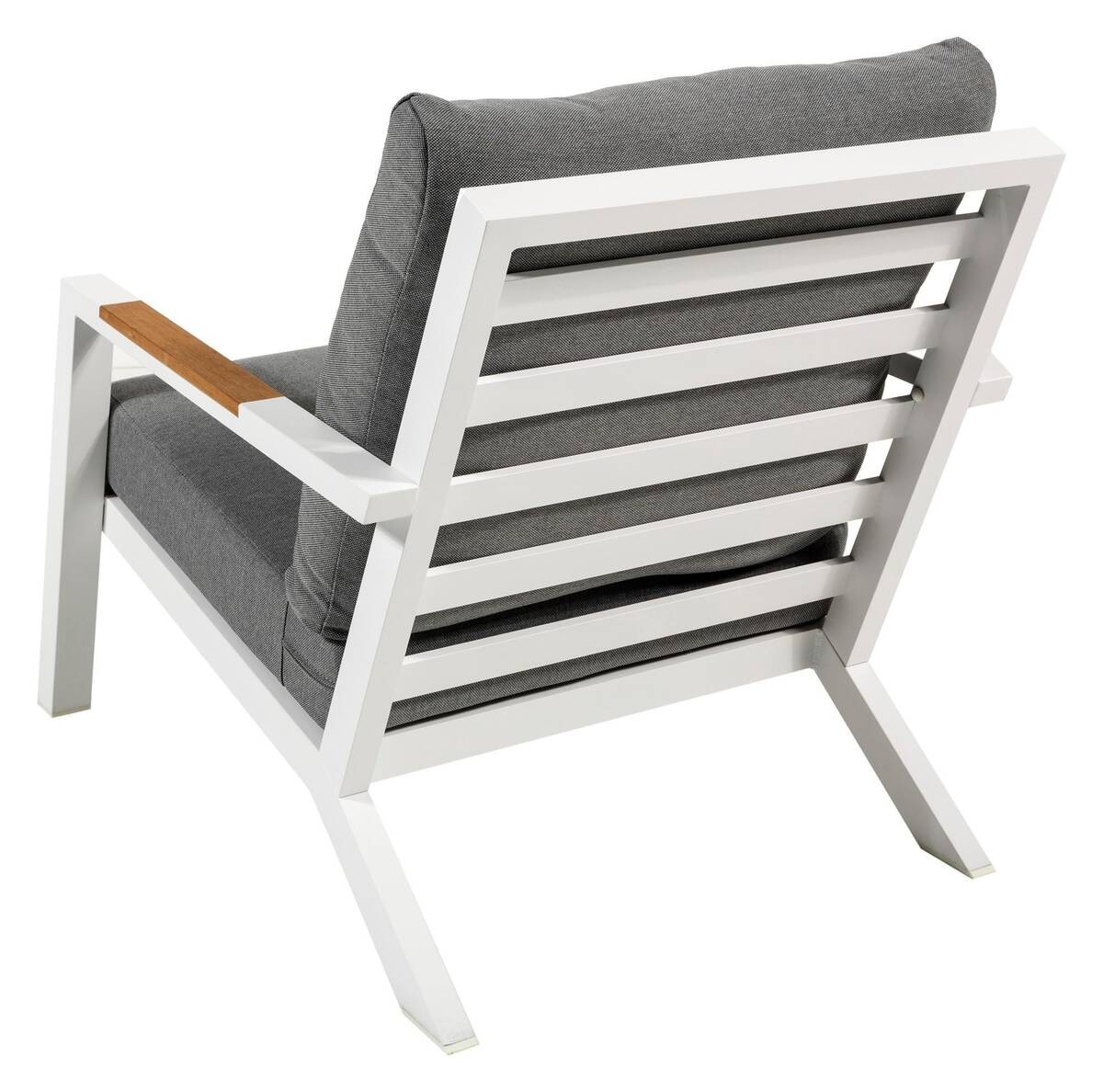 Añade un toque moderno a tu mobiliario de exterior con este sillón de jardín práctico, versátil y cómodo con estructura de aluminio, detalle en los reposabrazos de madera de teca y asiento de espuma de poliuretano gris para una mayor comodidad. Tapicería Olefin 100% con tratamiento repelente al agua, y desenfundables.