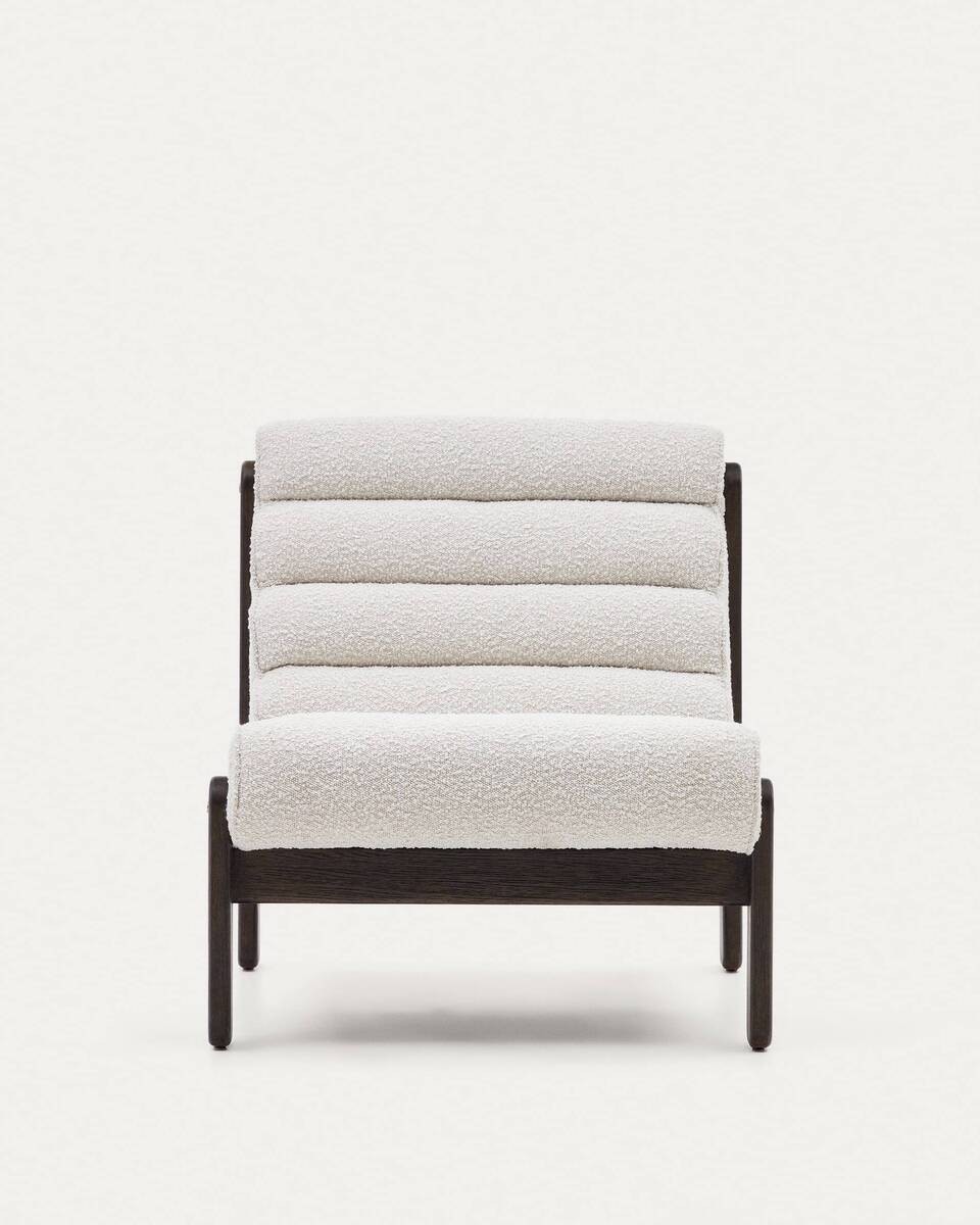 Un diseño exclusivo tapizado con tejido de borreguito blanco sobre una estructura de madera maciza de roble pintado en negro. Su asiento y respaldo presentados en una pieza única presentan un máximo confort gracias a su efecto michelín.