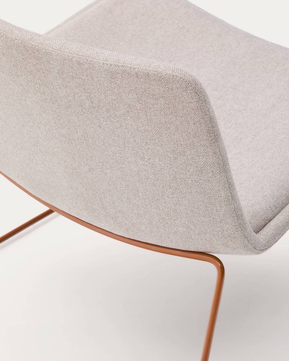 Con un diseño contemporáneo de líneas envolventes, la butaca Zahara aporta elegancia y calidez a cualquier ambiente. Su tapizado beige de textura suave y la estructura metálica con acabado terracota crean una pieza original y acogedora. Ideal para salones modernos o rincones de lectura con estilo.