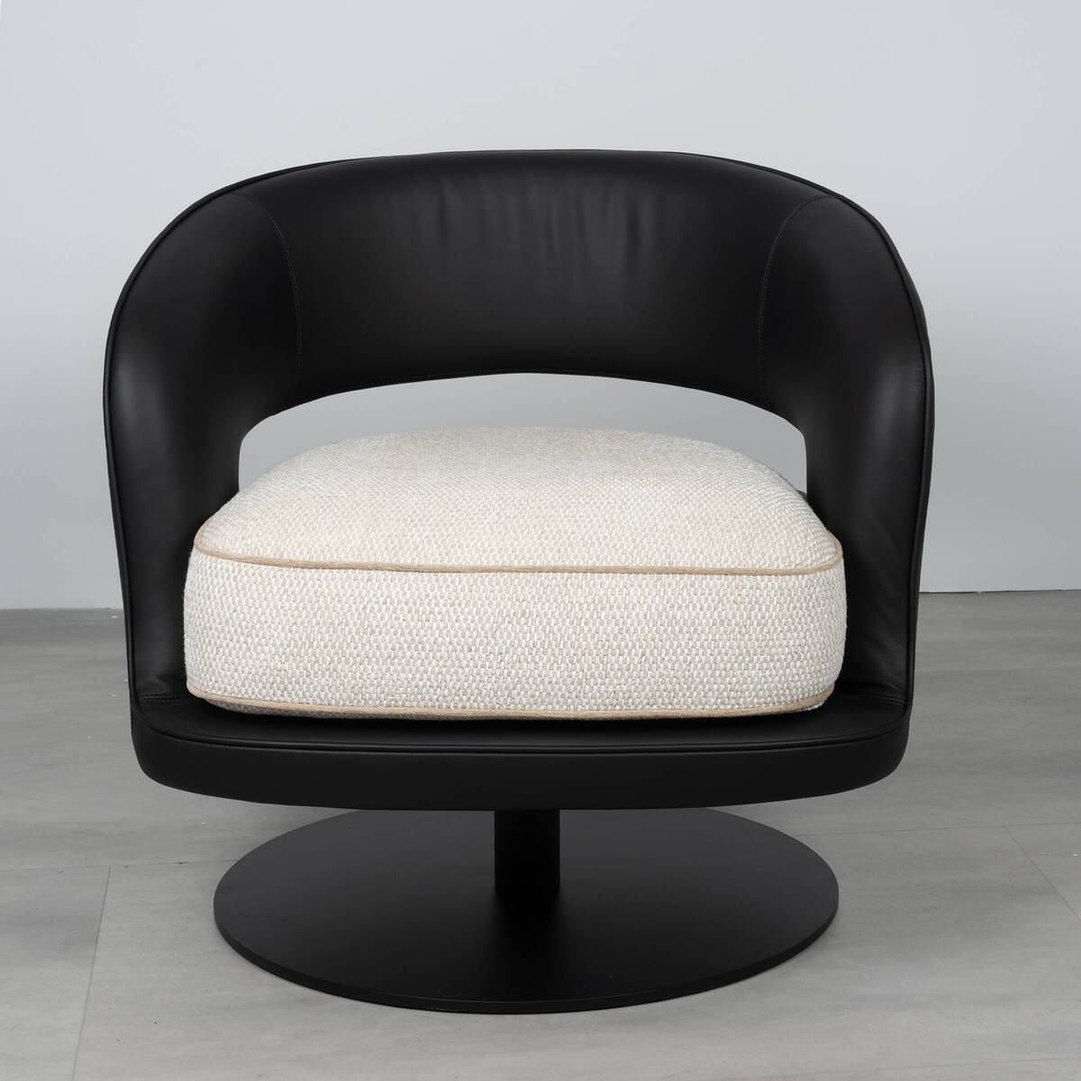 Sillón giratorio Lira que combina elegancia contemporánea y contraste de materiales en una pieza única. Su estructura envolvente tapizada en piel sintética negra aporta carácter y sofisticación, mientras que el asiento en tejido beige suaviza el conjunto y añade confort. La base metálica giratoria de 360º completa un diseño funcional y moderno, ideal para salones, despachos o rincones de lectura donde se busca destacar con estilo.