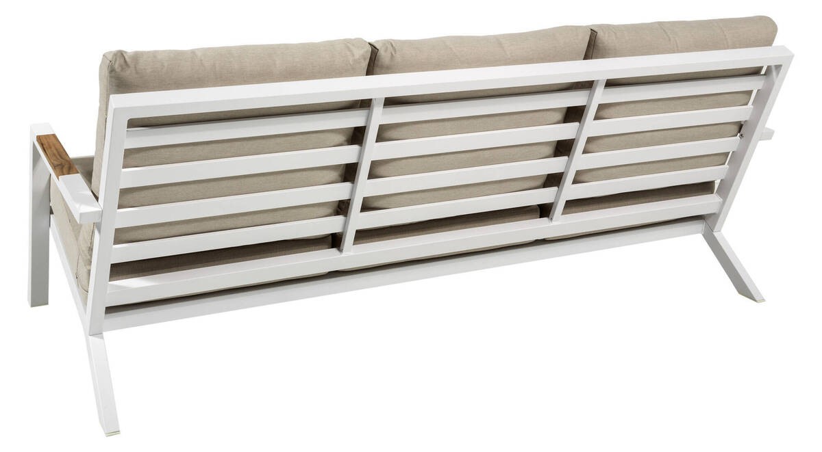 Sofá de tres plazas de líneas modernas con estructura de aluminio en color blanco, detalle en los brazos de madera de teca y asiento de espuma de poliuretano en color crudo que le ofrecerán la mayor comodidad. Tapicería Olefin 100% con tratamiento repelente al agua, y desenfundables.