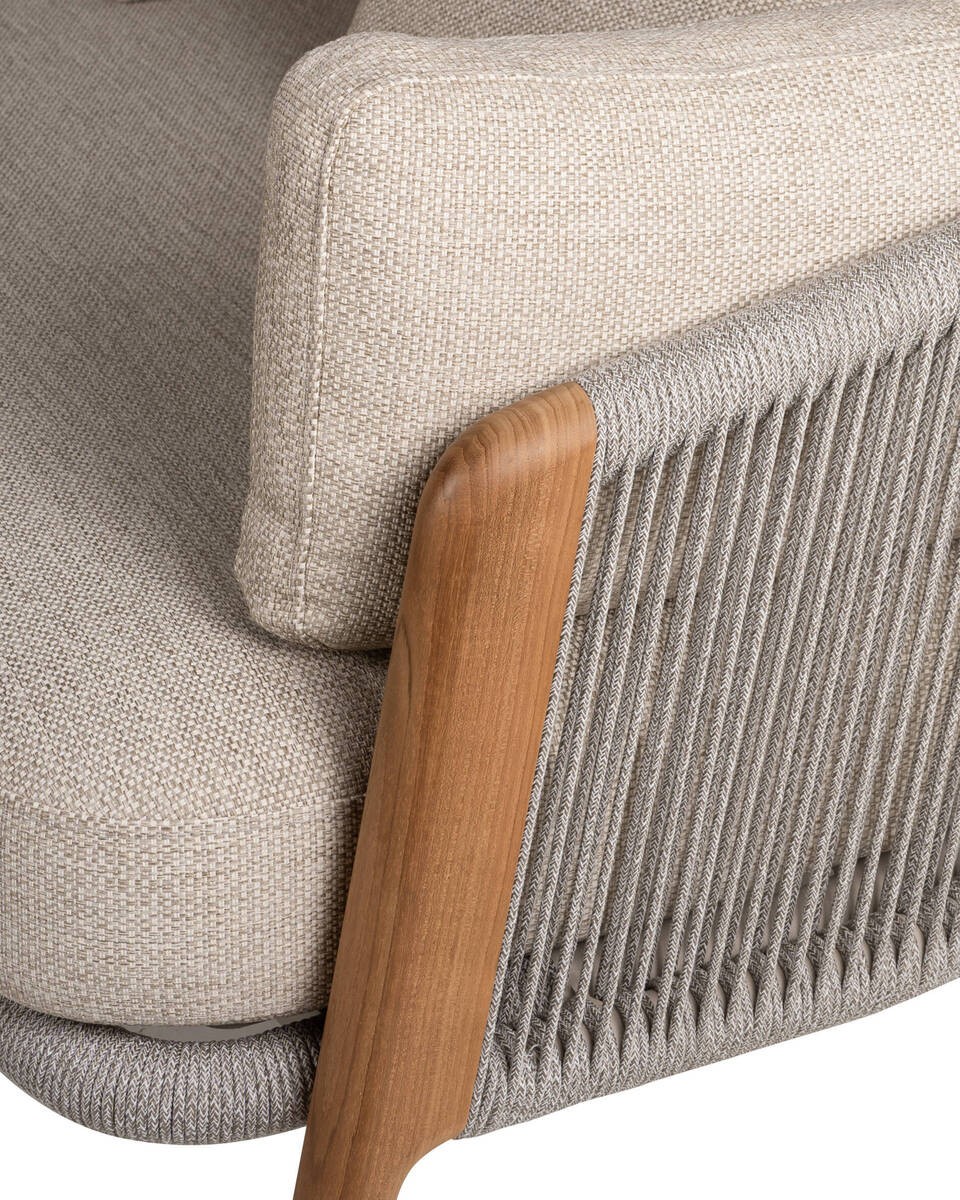 La cuerda entrelazada en su respaldo le aporta un toque moderno, mientras que los detalles en madera de teca añaden calidez y elegancia.