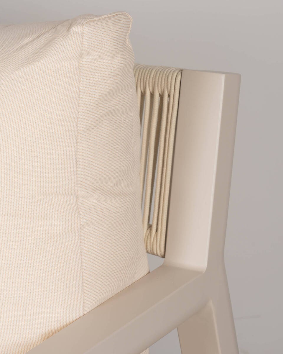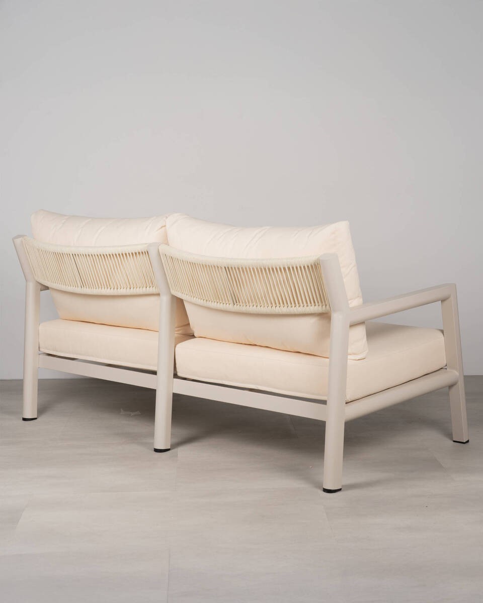 El sofá Nala de 2 plazas con estructura de aluminio de líneas rectas y cojines acolchados en tono beige claro. Su respaldo en fibra trenzada aporta un detalle moderno y resistente, ideal para combinar en salones o terrazas cubiertas.
