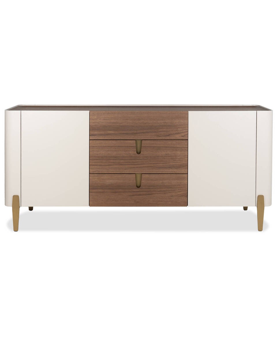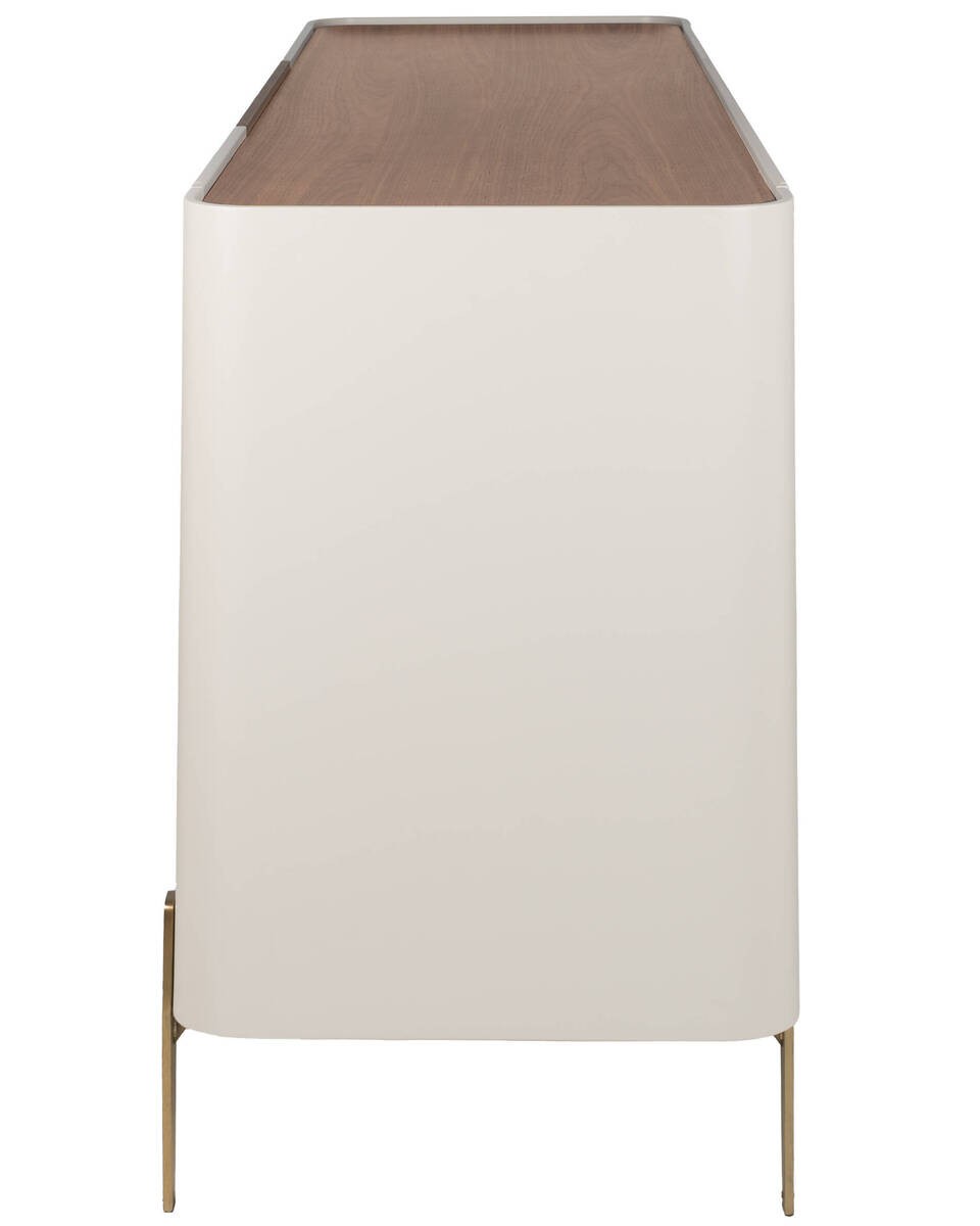 - Material de la estructura: Tapa superior y frentes de cajón en chapa de nogal curvada, laterales y puertas lacadas en beige mate, patas de acero inoxidable acabado latón cepillado