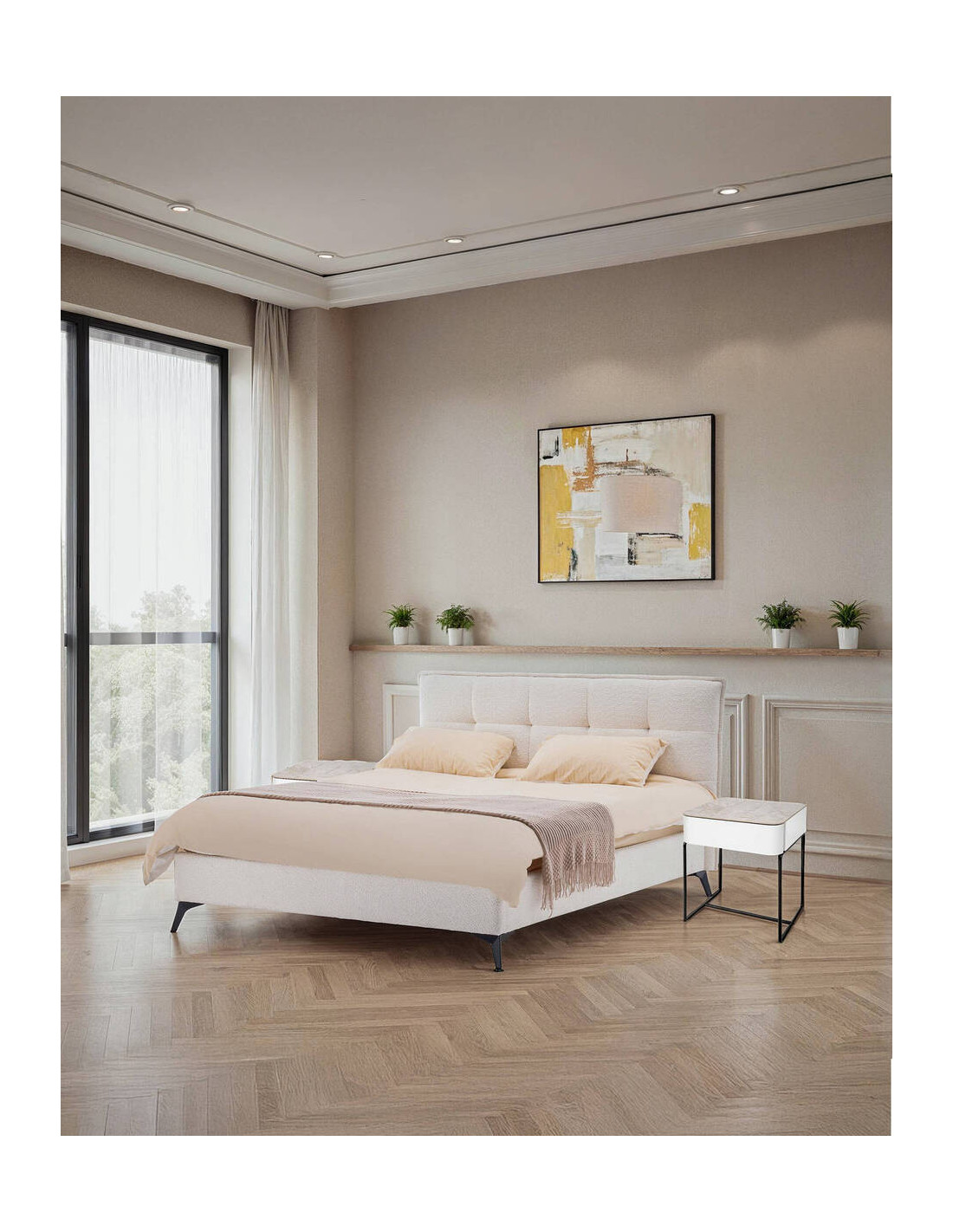 Diseño contemporáneo con la suavidad del tejido boucle blanco para ofrecer una pieza elegante y cómoda para tu dormitorio. El cabecero acolchado con diseño de cuadros aporta volumen y personalidad, mientras que la base tapizada y las patas metálicas negras añaden estabilidad y un toque moderno. Ideal para ambientes serenos y sofisticados.