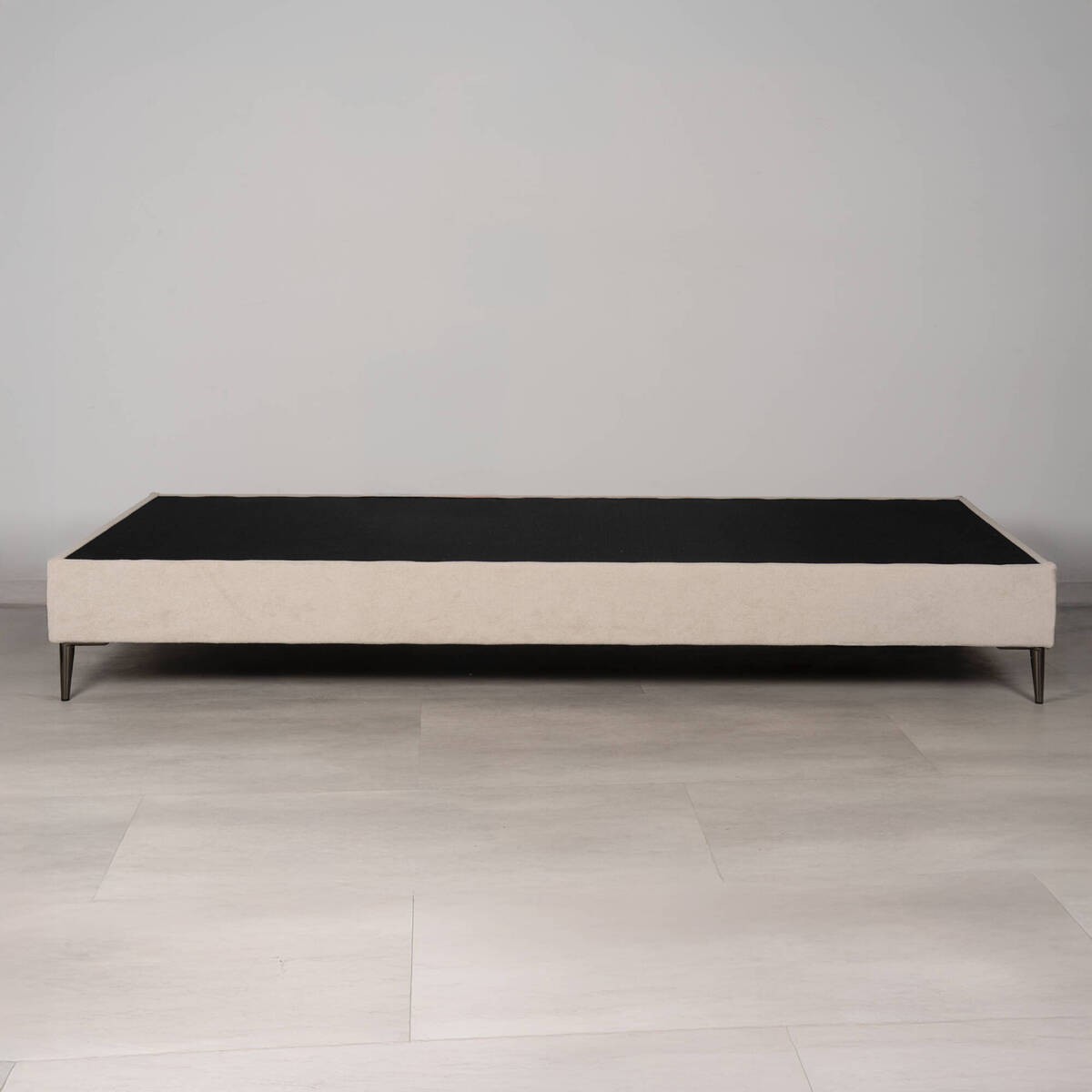 Base de cama diseñada para colchón de 90x200 cm, tapizada en tejido 100% poliéster en color piedra. Su estructura interior está fabricada en láminas de madera de pino, con una altura de 15 cm sin patas. Las patas son de metal negro cromado, aportando estabilidad y un acabado elegante.