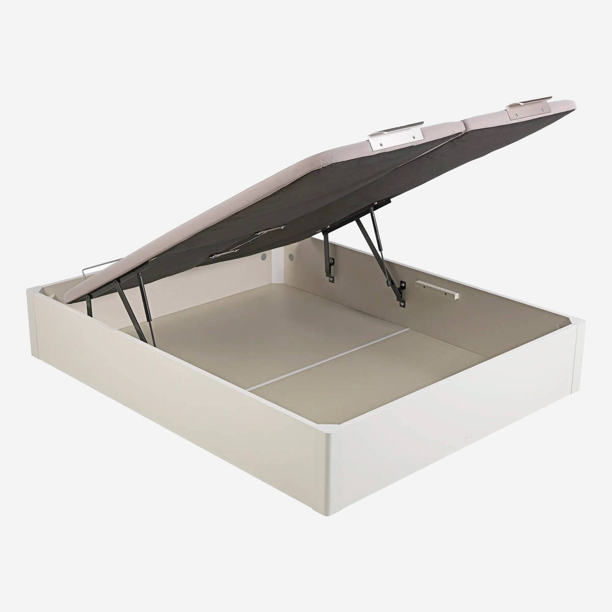 - Tecnología de la tapa: Estructura metálica de acero resistente reforzada con 5 travesaños transversales, equipada con tecnología Base Air System (B.A.S.), tirador de aluminio anodizado, arquillo sujeta colchón de acero en el cabecero, y sistema fácil de apertura frontal.