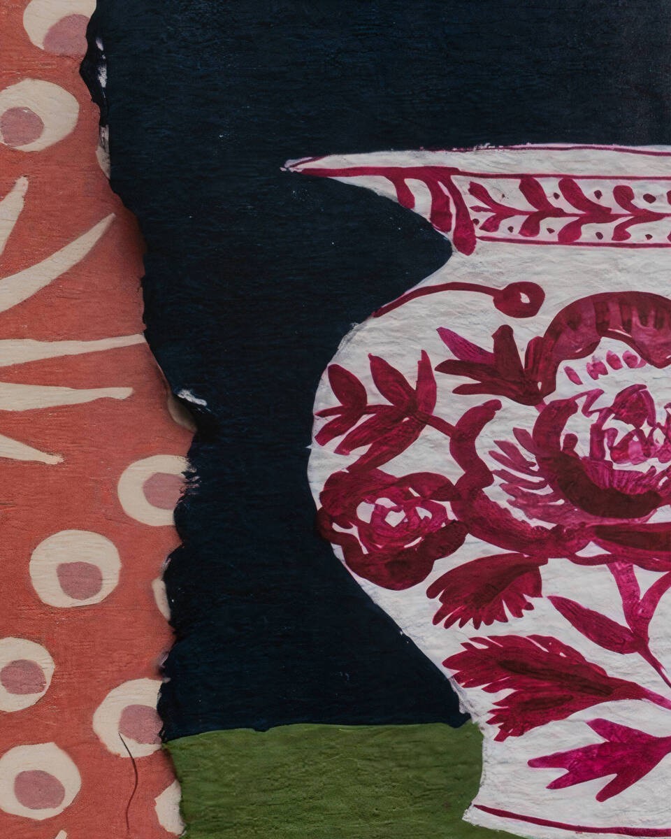 Este cuadro destaca por su estilo vibrante y artesanal, con una jarra blanca decorada con flores en tonos rojos y burdeos sobre un fondo de colores intensos. El contraste entre el azul profundo, el verde y el patrón geométrico en tonos tierra crea una composición llamativa y contemporánea. Una pieza ideal para aportar carácter y un aire creativo a cualquier estancia.