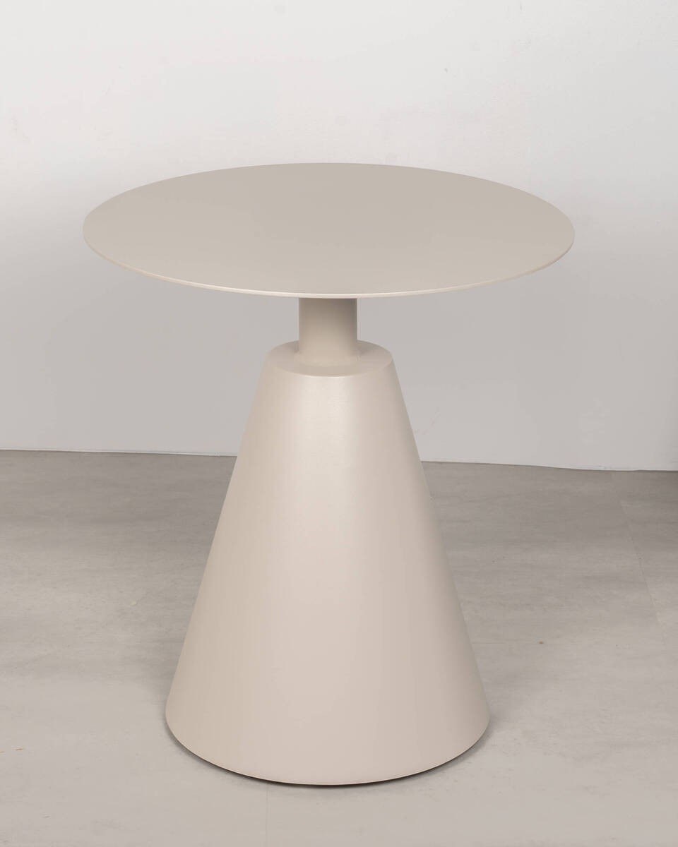 Mesa auxiliar Haven con un diseño geométrico moderno que combina un sobre circular con una base cónica sólida. Su estructura de aluminio con acabado en pintura en polvo garantiza resistencia y ligereza, perfecta para espacios interiores o exteriores cubiertos.