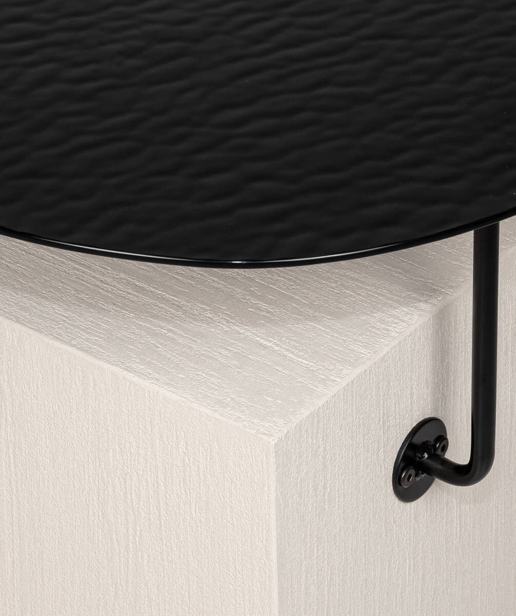 La mesa lateral Bran destaca por su diseño geométrico y su presencia discreta con una tapa de cristal superior negra con texturas en forma de olas, ideal para complementar espacios modernos o clásicos. Una pieza funcional y versátil para interiores.