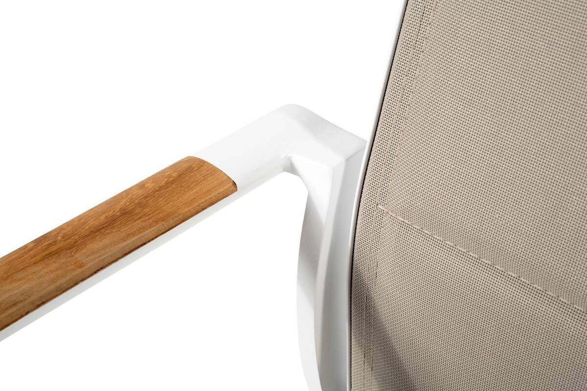 Lineas simples para un comedor de exterior. Fabricada con aluminio en color blanco con un ligeros toques naturales en sus reposabrazos de madera de teca. Dispone de un asiento y respaldo en textilene color gris taupe que contrasta con el color blanco de su estructura.