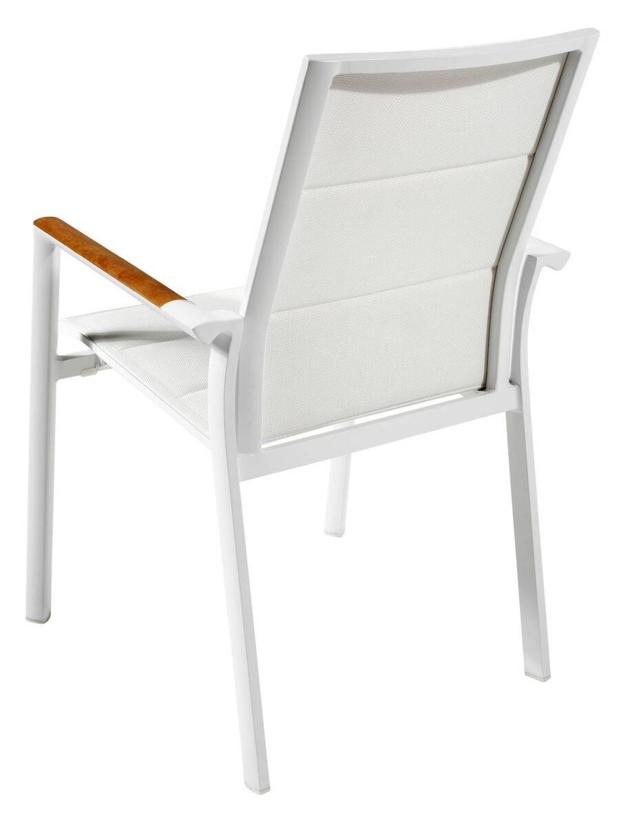 Lineas simples para un comedor de exterior. Fabricada con aluminio en color blanco con un ligeros toques naturales en sus reposabrazos de madera de teca. Dispone de un asiento y respaldo en textilene color blanco que acompaña al color blanco de su estructura.