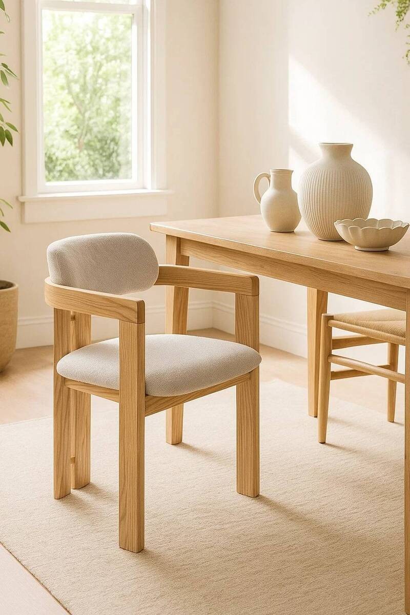 Diseñada para equilibrar estética y funcionalidad, destaca por su estructura en madera contrachapada con acabado roble y su tapizado en tejido bouclé blanco. El respaldo curvo incorpora un acolchado frontal que mejora el confort, mientras que el asiento está completamente tapizado para ofrecer una experiencia cómoda y envolvente. Su diseño atemporal encaja a la perfección en interiores escandinavos, naturales o modernos.