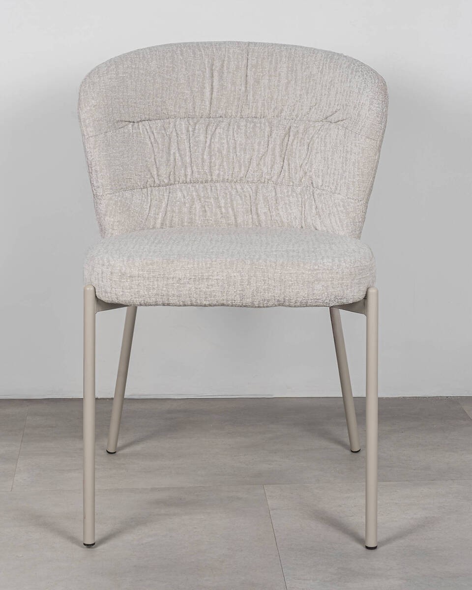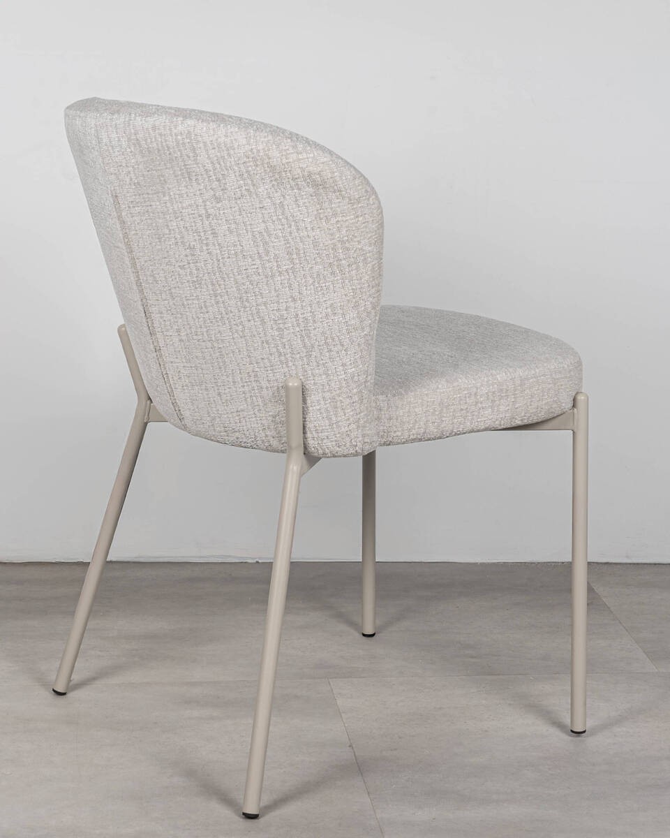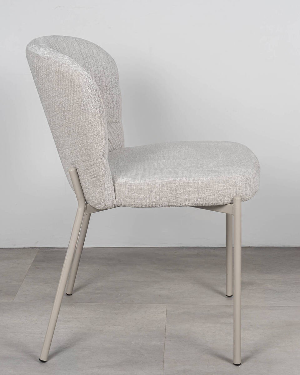 Silla de líneas suaves y contemporáneas, pensada para aportar comodidad y un look limpio en comedor o cocina. El tapizado se limpia fácilmente y las patas metálicas en tono beige gris aseguran estabilidad y un acabado uniforme.