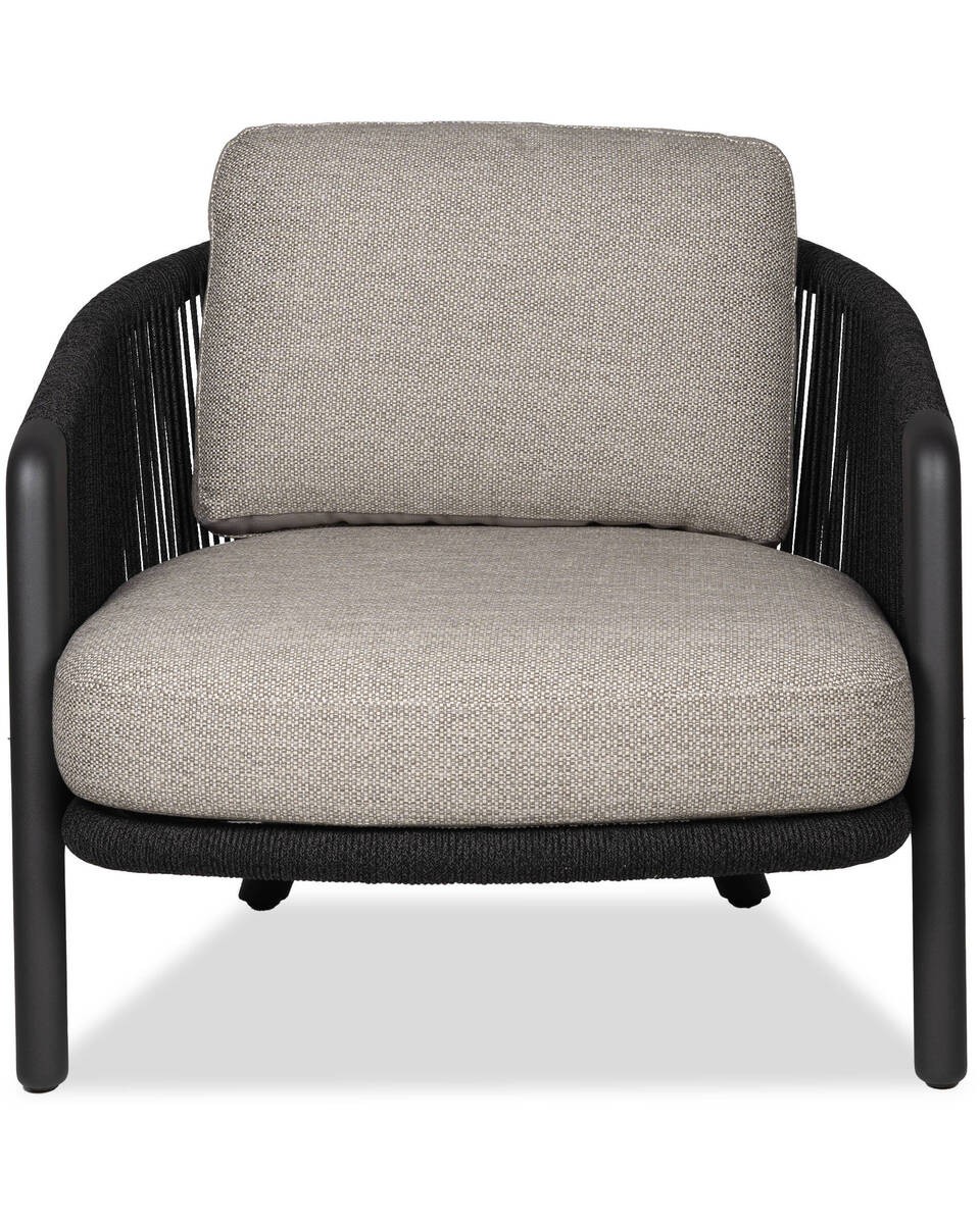 Transforma tu espacio exterior con un sillón que une líneas curvas y un refinado entrelazado de cuerda. Ideal para añadir comodidad y estilo en cualquier rincón chillout.