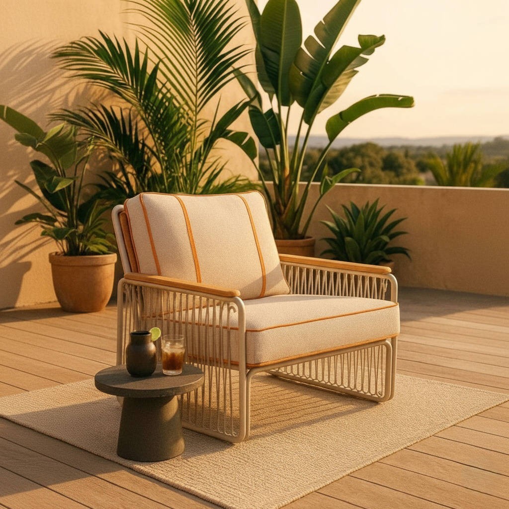 La butaca Arena combina diseño contemporáneo con materiales de alta calidad para ofrecer una experiencia de confort y estilo en exteriores. Su estructura refinada y detalles naturales la convierten en una pieza ideal para terrazas, porches o zonas chill-out.
