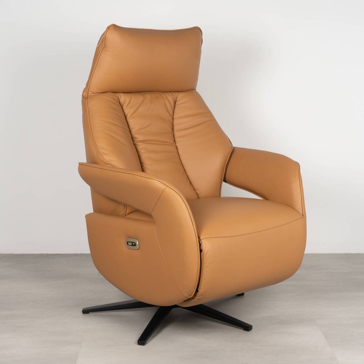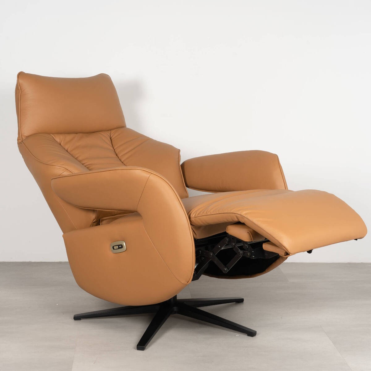 Un sillón relax diseñado para disfrutar del descanso con el máximo confort. Tapizado en piel natural en elegante color marrón coñac, aporta calidez y sofisticación al salón. Su sistema motorizado permite ajustar respaldo y reposapiés de forma suave y cómoda mediante un único botón, logrando una posición de relax perfecta creando un estilo mid-century.
