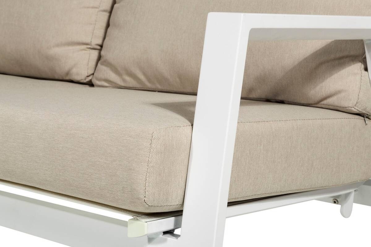 Llegó la hora de sacarle partido a tu terraza o jardín, y que mejor que con este sofá rinconera compuesto por cuatro módulos que te permitirán crear una amplia zona de relax. Combina una resistente estructura de aluminio en color blanco con una tapicería en textilene color arena desenfundable e impermeable. Un sencillo y moderno diseño de líneas rectas fácil de combinar con cualquier estilo decorativo. ¿Su punto fuerte? el grosor de sus cojines que le aportarán una mayor comodidad a su sentada. Protección en las patas con tacos de plástico para evitar rayar los suelos más delicados.