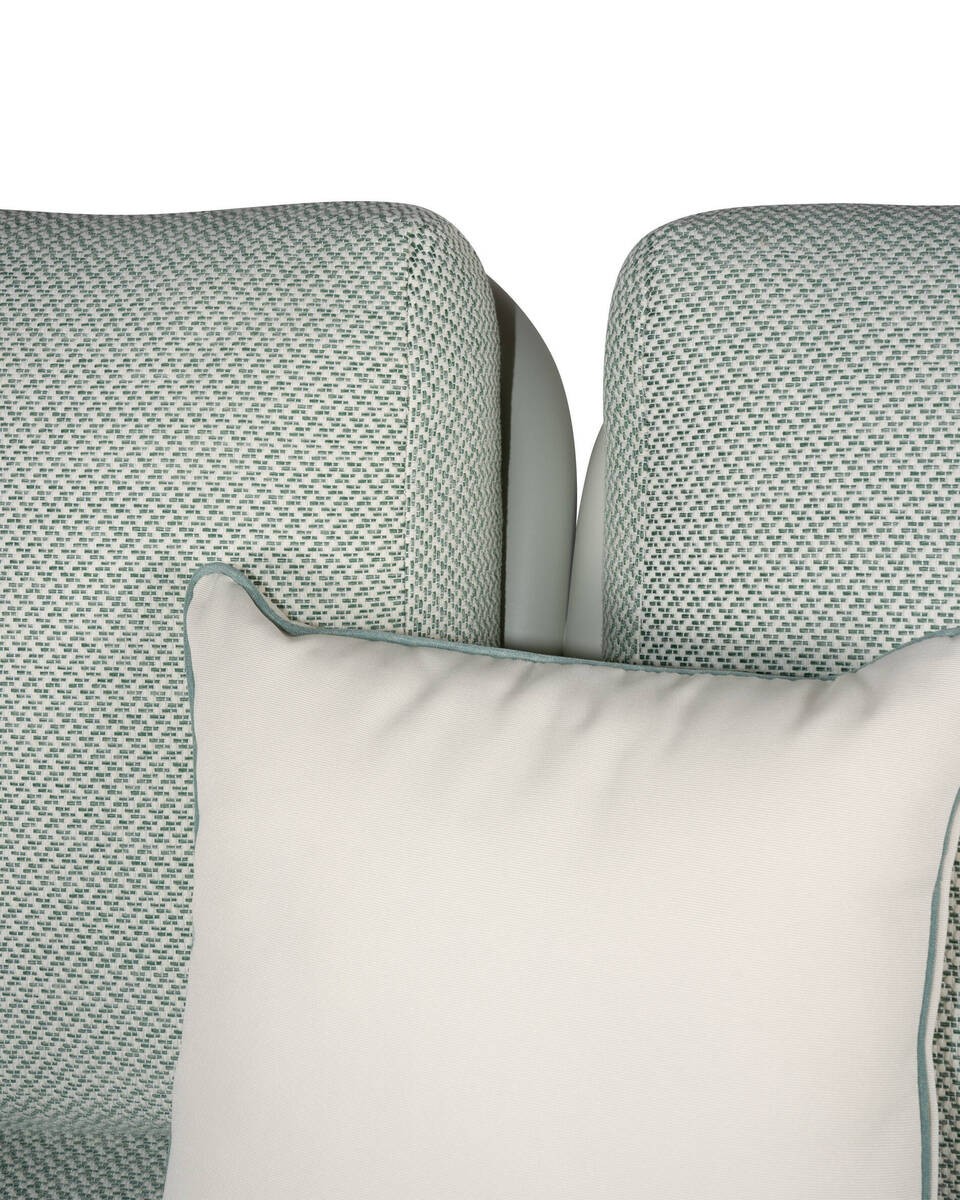 Un diseño moderno y contemporáneo construido con una estructura de aluminio crema y un elegante respaldo de cuerda entrelazada en verde. Sus cojines en tonos beige verde añaden un toque de sofisticación, perfecto para crear un ambiente elegante y actual en cualquier espacio exterior. Se le agegan dos brazos de madera de teca natural para aportarles una pincelada natural.