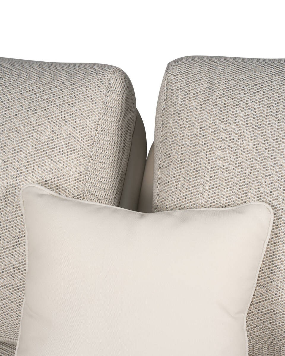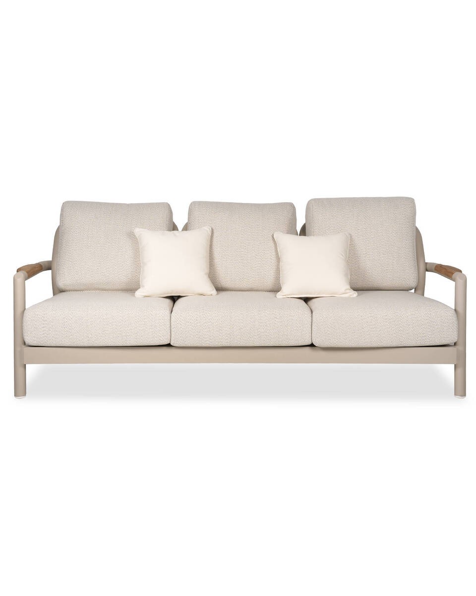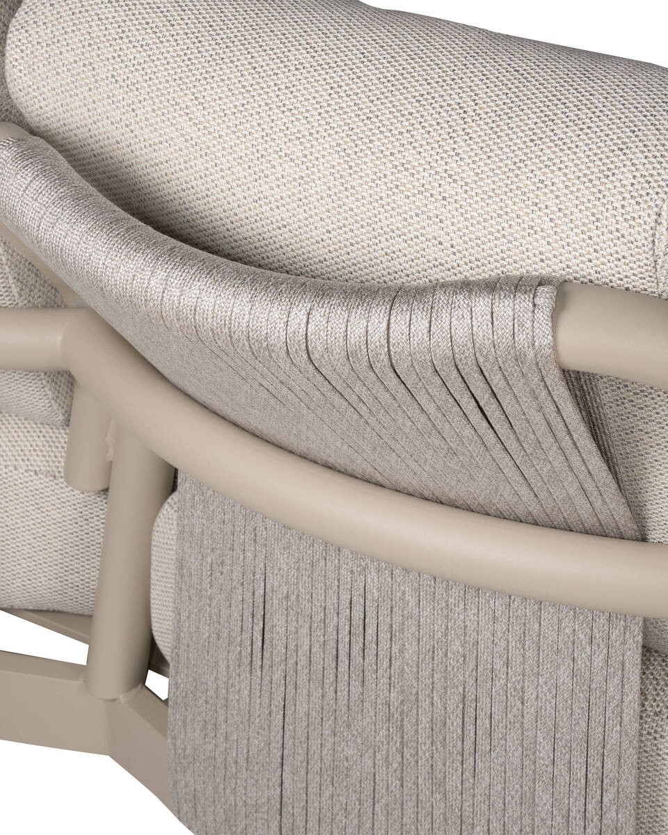 Un diseño moderno y contemporáneo construido con una estructura de aluminio crema y un elegante respaldo de cuerda entrelazada en beige. Sus cojines en tonos beige añaden un toque de sofisticación, perfecto para crear un ambiente elegante y actual en cualquier espacio exterior. Se le agegan dos brazos de madera de teca natural para aportarles una pincelada natural.